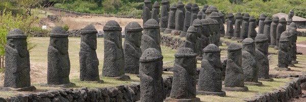 On poursuit notre balade et, tout en marchant le long d’immenses pierres, on arrive rapidement devant une reconstitution de village traditionnel. Outre les quelques maisons au toit de chaume et les nombreux pots à kimchi, ce qui retient notre attention, c’est l’alignement de 48 Dol Hareubang, autrement dit « grands-pères » de pierre. Antiques représentations de divinités qui protégeaient la population des démons, ces statues sont vraiment symboliques de l’île. D’ailleurs, on en voit partout, à l’entrée des ponts, devant les hôtels et surtout sur les étals de souvenirs !
