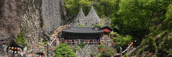 Avec les nombreuses lanternes accrochées pour fêter l’anniversaire de Bouddha, le site est très coloré. Mais surtout, il y a foule ! Alors que jusqu’ici nous n’avions croisé que des randonneurs bien équipés, on comprend qu’il y a un deuxième accès bien plus facile et bien plus couru que celui que nous avons emprunté…