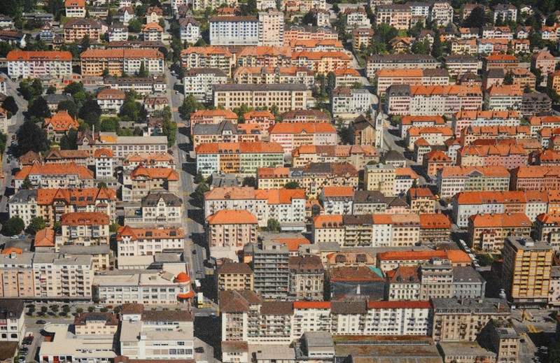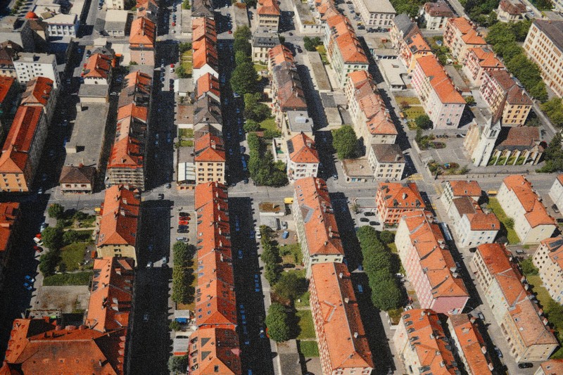 Mais ce qui nous surprend le plus, ce sont les photos actuelles – vues du ciel – de la ville dont le plan en damier accroche le regard…