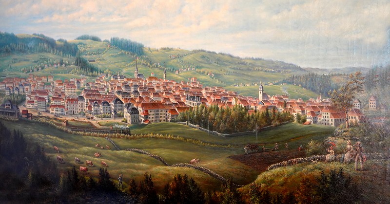 Comme l’Office de Tourisme n’ouvre qu’à 13h30 – on doit y récupérer de la documentation, dont un itinéraire à faire à pied – on commence par visiter le musée d’Histoire, ce qui nous permet d’en apprendre plus sur la création de la cité. Fondée en 1656, la ville doit principalement son essor et sa renommée à l’horlogerie. En effet, même si l’horlogerie suisse trouve son origine à Genève au XVIe siècle, elle arrive rapidement dans la région de Neuchâtel où les paysans des montagnes occupent leurs longues soirées à des activités artisanales comme le travail du bois ou du fer. Un siècle plus tard, l’introduction, puis la maitrise du savoir horloger modifie totalement le destin La Chaux-de-Fonds qui va peu à peu devenir un centre mondial dans le domaine.