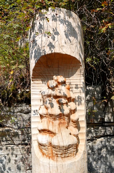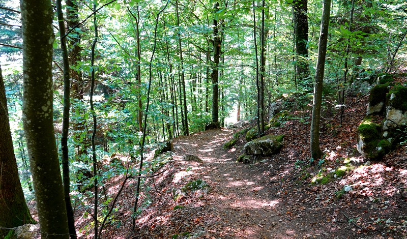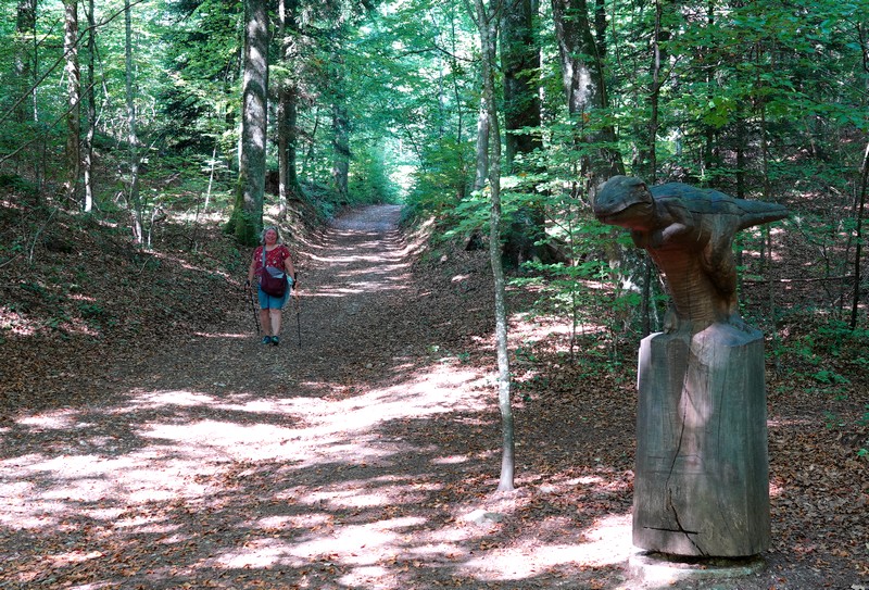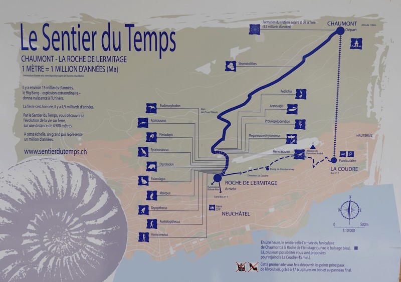 • Sentier du Temps, au départ du sommet du funiculaire, très bien fléché (marques bleues, parfois losange jaune, animaux en bois, attention à ne pas rater la bifurcation à gauche au niveau du hibou à cause de la végétation), 5.5km, 610m-, 2h jusqu’à la gare de Neuchâtel, sans se presser. Parcours assez facile et agréable quand il fait chaud car très ombragé. Sentier parfois escarpé. Bonnes chaussures indispensables. Livret explicatif disponible sous pdf à imprimer.