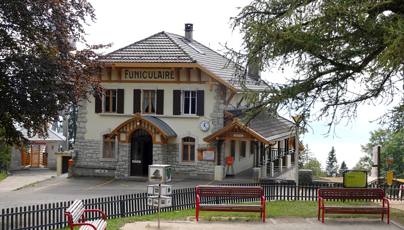De retour à terre, on saute dans le bus 107 qui nous dépose rapidement devant le funiculaire reliant la Coudre à la montagne de Chaumont en dix minutes, presque six cents mètres plus haut. D’une longueur de 2102 mètres, il est en service depuis le 17 septembre 1910. A un jour près, on fêtait donc ses 110 ans ! Dès l’origine, la traction du funiculaire était électrique, et il comportait deux voitures, l’avalante faisant contrepoids pour tracter plus facilement la montante. En 2007, de grosses rénovations ont été faites, et désormais il n’y a plus qu’une seule voiture actionnée par une puissante machinerie.