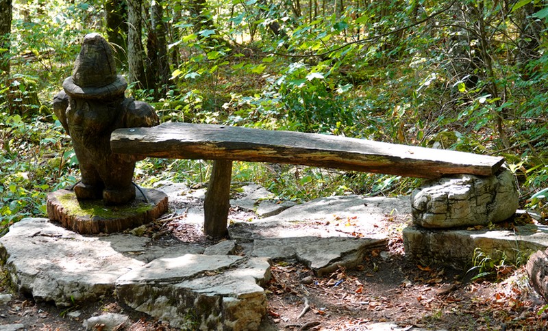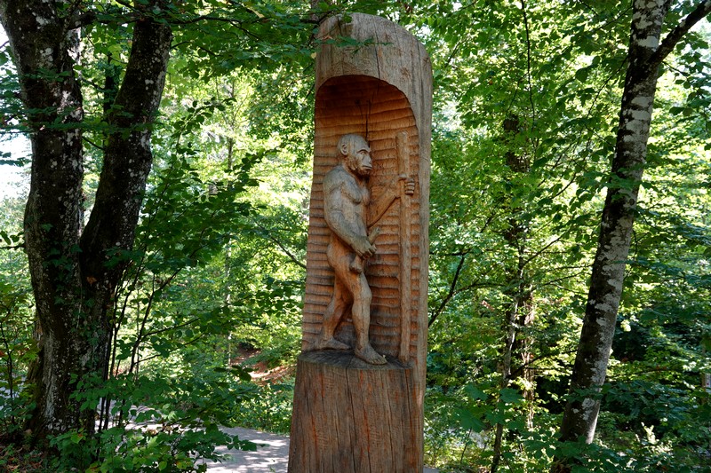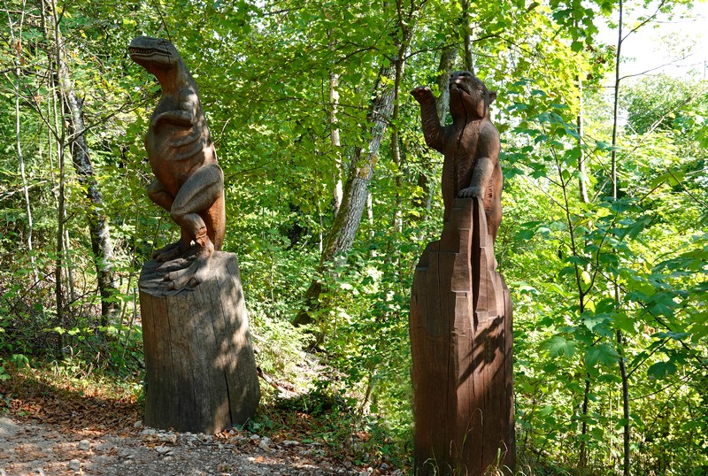 Le chemin continue, tantôt accidenté, tantôt plus tranquille, mais toujours sous les arbres ce qui est agréable vu la grosse chaleur. Le tracé est très bien fait, et une heure après avoir croisé les stromatolithes, on parvient devant la statue d’un trilobite, apparu il y a 535 millions d’années. Ensuite, tout s’accélère, en moins de dix minutes, on passe du cambrien au Crétacé, et en quelques pas, on se retrouve devant le premier hominidé !