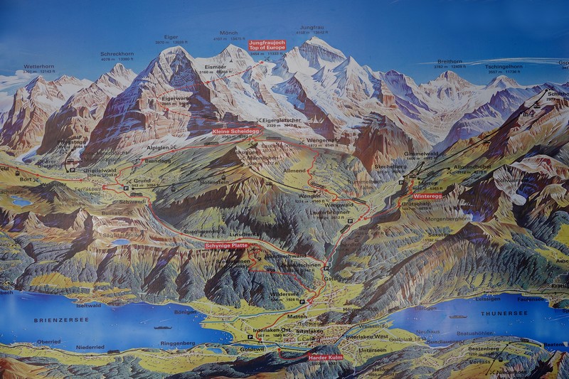 Ciel gris et bas, ce matin… On en profite pour se débarrasser de quelques corvées : lessive – avec une sécheuse qui ne veut pas sécher ! – et ménage pour Gérard, cuisine pour moi, histoire d’être tranquilles les trois jours à venir. En effet, à partir de demain nous emprunterons les différentes remontées – trains, télécabines… – du domaine avec le pass Jungfrau, ce qui nous permettra d’effectuer de belles balades à pied. Au programme : la gare ferroviaire de Schynige Platte accessible en petit train à crémaillère, la montée au First depuis Grindelwald et bien sûr la célèbre ascension mythique en train à la Jungfrau ! Le seul bémol à ce fantastique programme : la météo qui s’annonce malheureusement incertaine et risque d’invalider certaines des randos prévues…