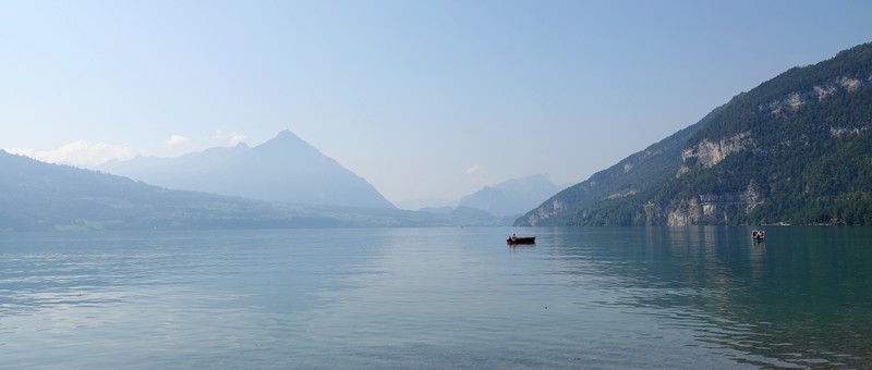 Ensuite, on pinaille un peu – beaucoup ! – pour trouver la route de Bönigen. Mais après quelques tours et détours – dont la traversée de la piste de l’aéroport d’Interlaken qui, heureusement, ne semble pas en activité – on rejoint le lac de Brienz.