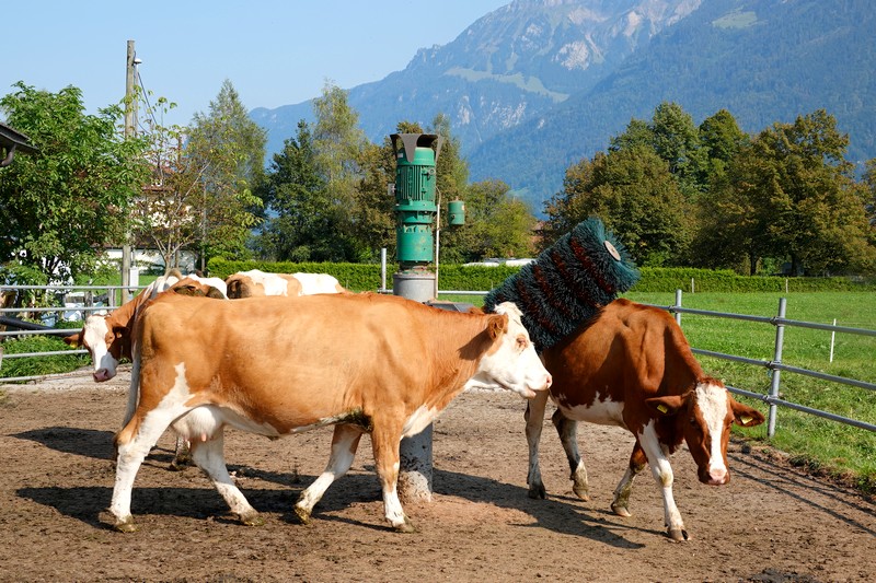 Mais il ne faut pas en déduire que les bêtes sont mal traitées : au contraire, elles sont choyées ! Eh oui, jamais auparavant, on avait vu de vaches se faire gratter le dos grâce à une machine spécialement conçue pour elles et munie de grosses brosses tournantes !