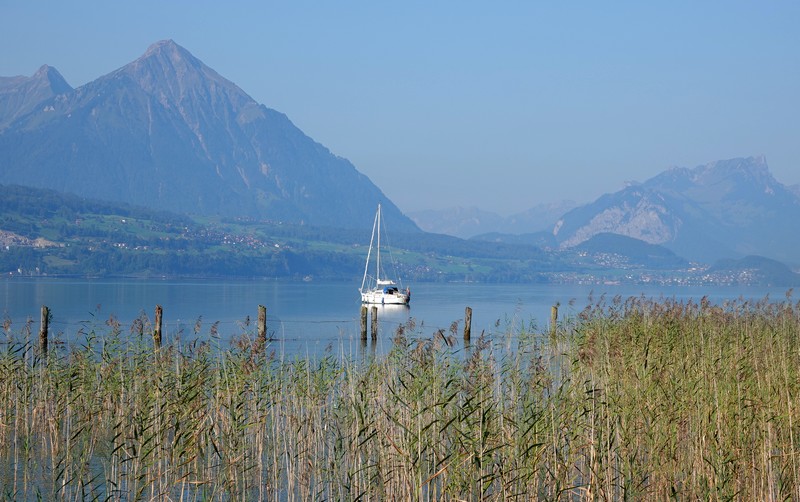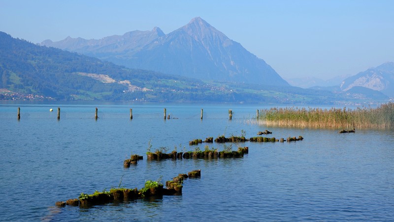 Le soleil étant au beau fixe, on repousse aux calendes grecques notre journée de repos. Toujours à vélo, on part cette fois vers le golf, et on emprunte un sentier qui traverse la réserve naturelle de Weissenau en longeant le lac de Thoune. La circulation étant interdite à tout véhicule, on pousse les vélos un bon moment. Mais on ne regrette pas l’effort, tant les vues sont splendides.