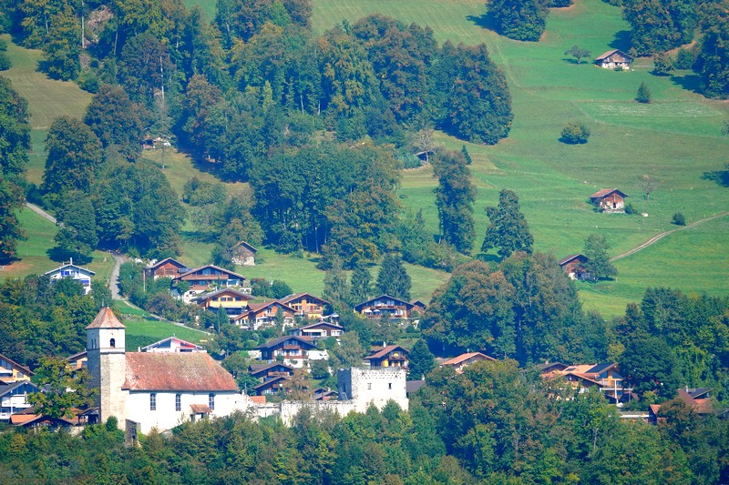 J’avais prévu une journée de repos, mais comme souvent, on est impatients de découvrir les environs, alors on saute sur les vélos pour un premier tour. Au-dessus de nos têtes, vers l’ouest, le Harder Kulm culmine à 1321m d’altitude…