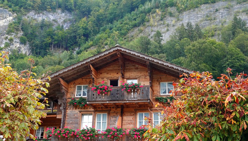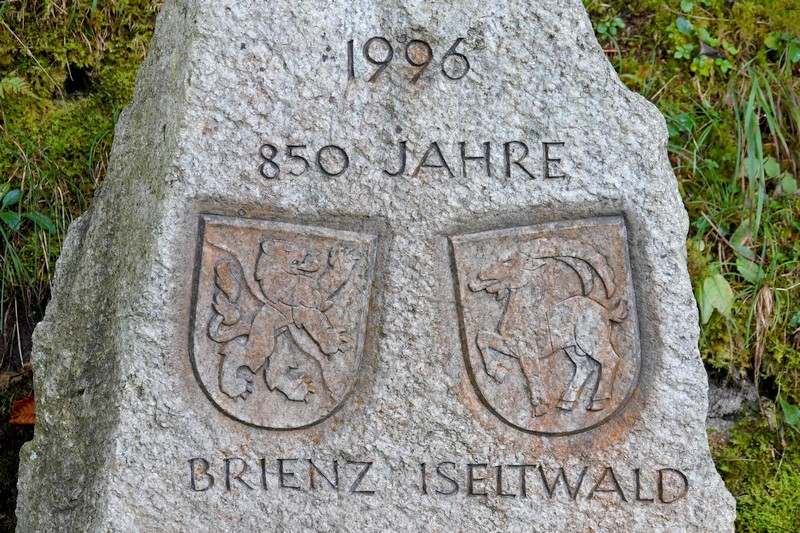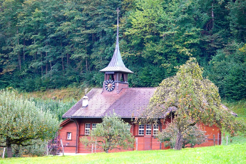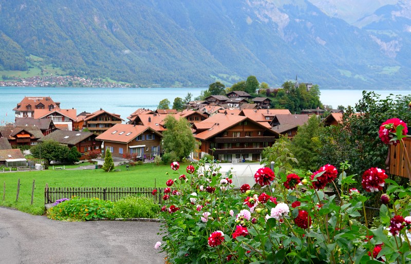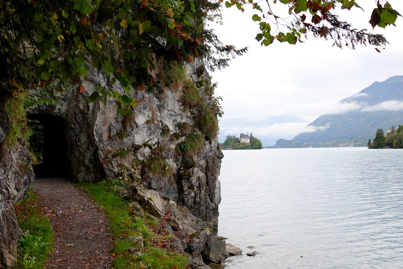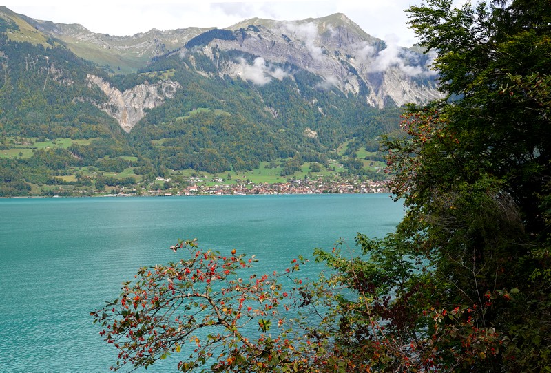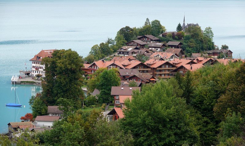 C’est sous quelques gouttes de pluie que nous prenons notre désormais habituel bus 21 pour rejoindre la gare ouest d’Interlaken. Là, changement de véhicule, et c’est à bord du 103 que nous gagnons en trente minutes Iseltwald, un petit village situé sur la rive nord du lac de Brienz. C’est aussi ce matin que débute la validité de notre Swiss Travel Pass, une carte très pratique qui va nous permettre non seulement des voyages illimités en train, bus et bateau, mais aussi l’accès libre à quasiment tous les musées du pays. Nous descendons à la station Mühle, située sur les hauteurs d’Iseltwald, ce qui nous offre une superbe vue sur le bourg.