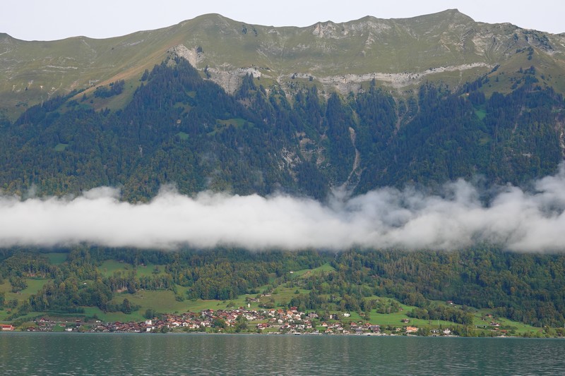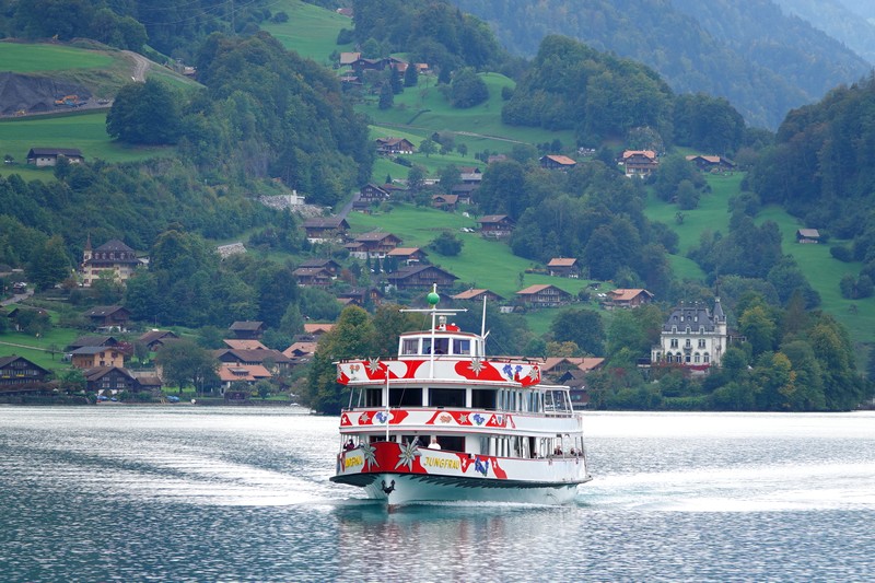 On patiente jusqu’à 13h51 – toujours cette magnifique précision suisse ! – heure à laquelle un bateau de ligne nous ramène vers Interlaken en une heure, après un beau parcours qui nous fait revoir les villages d’Iseltwald et de Bönigen…
