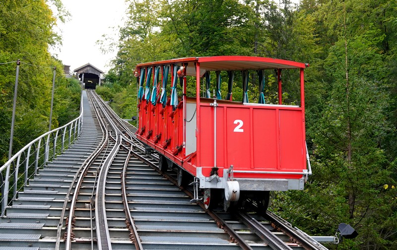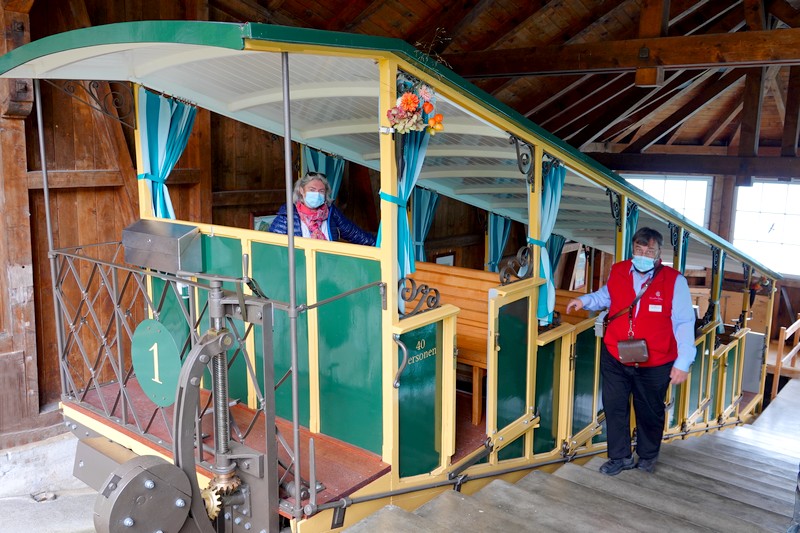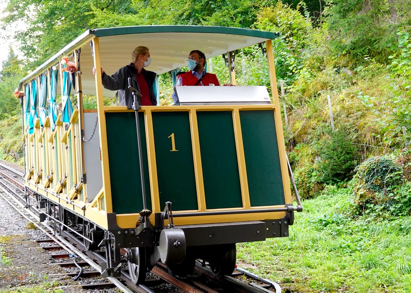 Après une heure trente de marche et quelques arrêts photos, on arrive au pied du funiculaire de Giessbach, posé au beau milieu de la nature, à quelques mètres du lac et de l’embarcadère. Inauguré en 1879 – ce qui en fait le plus ancien funiculaire de Suisse encore en exploitation ! – pour relier le Grand Hôtel bâti sur les hauteurs, il a conservé son charme d’antan, avec ses cabines sans fenêtres. C’est aussi le premier chemin de fer dans le monde pourvu d’une voie de croisement à mi-chemin, inventé par Roman Abt. Il n’y a pas d’horaires fixes de départs, en général, il se met en marche avant et après l’arrivée des bateaux de Brienz et d’Interlaken. A 10h45, nous sommes les seuls clients à l’emprunter…