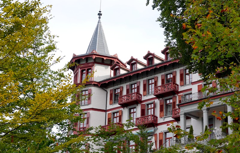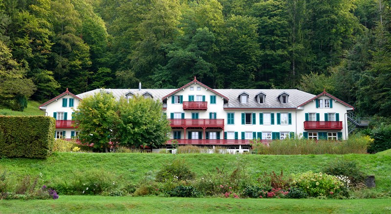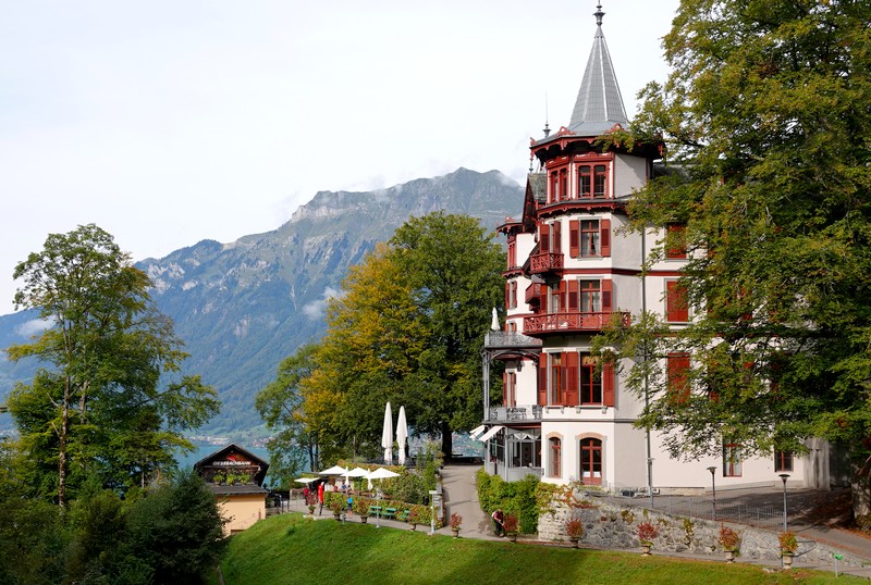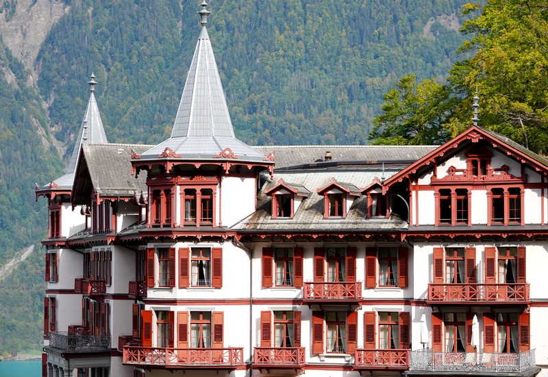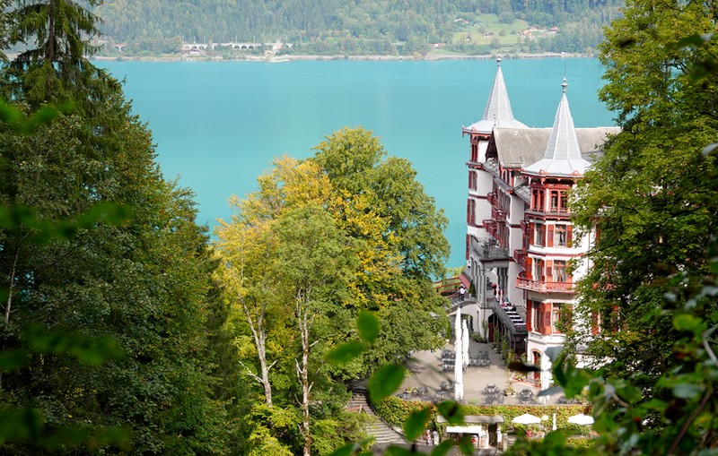 On redescend donc vers le Grand Hôtel, construit en 1874 par l’architecte français Horace Edouard Davinent, sur une demande de la famille Hauser, des hôteliers originaires de Zürich. La belle élégance et l’audace architecturale de l’établissement, alliées au magnifique environnement, lui valent rapidement une renommée internationale. Jusqu‘à l‘éclatement de la guerre en 1914, Giessbach est le rendez-vous de la haute société et artistes célèbres, têtes couronnées, hommes d‘Etat et diplomates s‘y retrouvent chaque été. Deux guerres mondiales plus tard, le palace tombe lentement dans l’oubli, et ferme ses portes en 1979. Une démolition du site est même projetée afin d’y construire un super chalet de béton, un concept plus en vogue en cette fin de XXe siècle. Heureusement, en 1983, Franz Weber, un écologiste suisse, et sa fondation parviennent à racheter les 22ha du domaine. Son idée est d‘offrir Giessbach au peuple suisse et d‘en assurer ainsi à tout jamais la sauvegarde. Après plusieurs années de travaux de restauration, le bel hôtel retrouve vie, et comme le souhaitait Franz Weber, devient propriété commune du peuple suisse. Il accueille de nouveau de nombreux clients, sensibles au charme suranné de cette vieille bâtisse posée dans un si bel écrin.