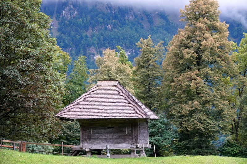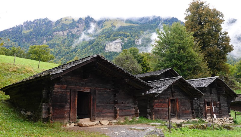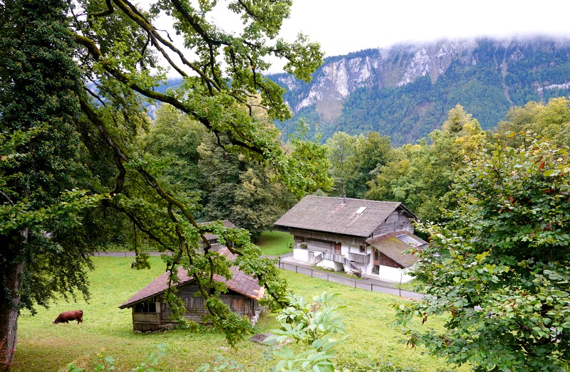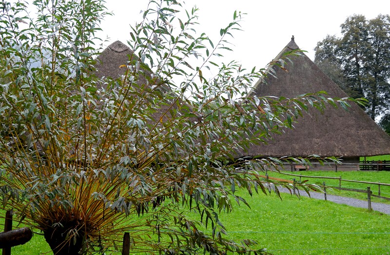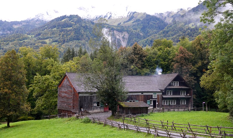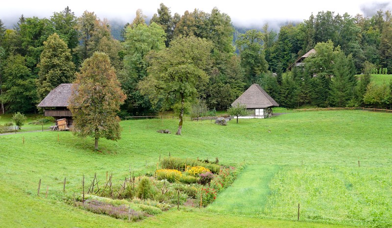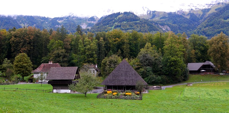 Cette météo peu engageante ne nous dissuade tout de même pas d’entreprendre le programme prévu, et à 8h10, on prend notre bus 21 pour Interlaken Ost. De là, un train nous mène à Brienz en une vingtaine de minutes, d’où on saute dans le bus 151 pour le Freilichtmuseum de Ballenberg, autrement dit le musée en plein de l’habitat rural suisse, situé à l’extrémité est du lac de Brienz, en direction de Meiringen. Le trajet ne nous a pris qu’une petite heure, les transports s’étant enchainés à merveille ! Il est donc 9h15 quand on arrive devant la billetterie ouest du site. On fait viser nos Swiss Travel Pass – qui nous font bénéficier d’une entrée gratuite – puis on pénètre dans le parc sans avoir à attendre l’heure d’ouverture prévue à 10h. On peut en effet commencer la visite dès 9h, sachant que les intérieurs des bâtiments n’ouvriront qu’un peu plus tard. Mais vue l’étendue du site, autant prendre un peu d’avance !