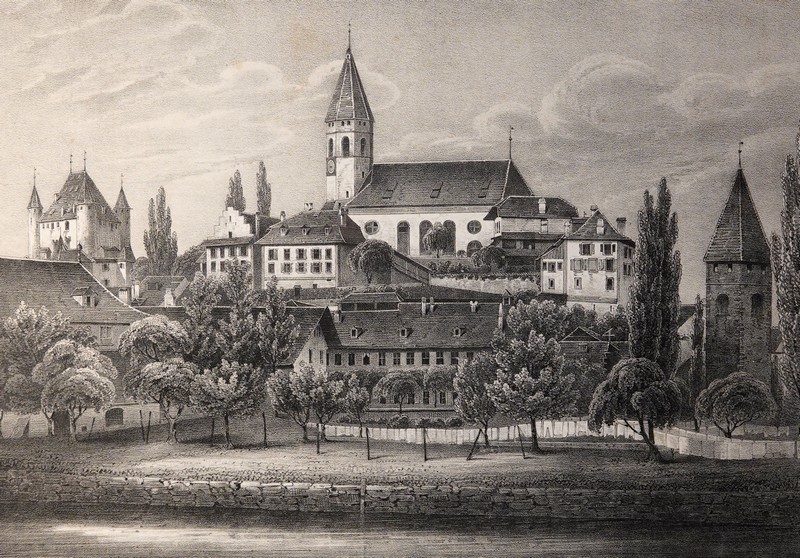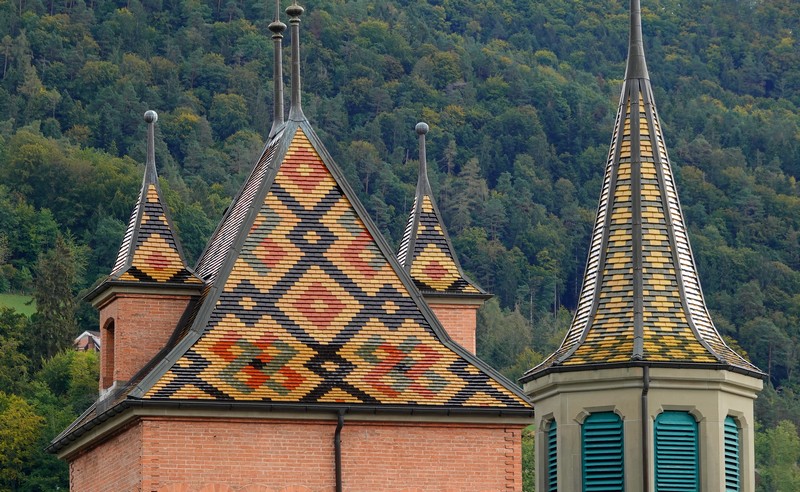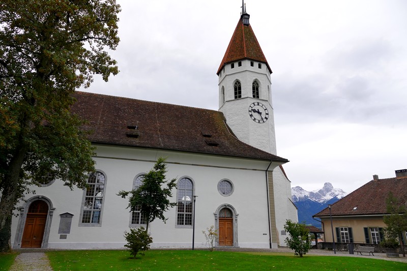 On y reviendra dans la matinée, donc on ne s’attarde pas et on emprunte un tunnel, puis un ascenseur censé nous mener rapidement et sans fatigue vers l’église et le château. C’est sans compter une erreur d’aiguillage, car finalement, on se retrouve devant un escalier de 124 marches à gravir ! On apprécie cette précision toute suisse qui, au fil des paliers, nous fait le décompte des pas restant à franchir… Après cette bonne mise en jambe, on parvient devant la Stadtkirche, autrement dit l’église paroissiale de Thoune. Flanquée d’une tour octogonale élevée en 1330 – mais a priori rénovée, puisque la nef ne fut finalisée qu’en 1740, dans la forme classique de temple protestant – le parvis offre une vue plongeante sur la ville et le lac.