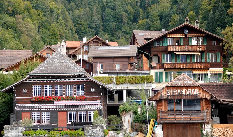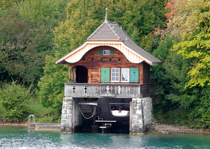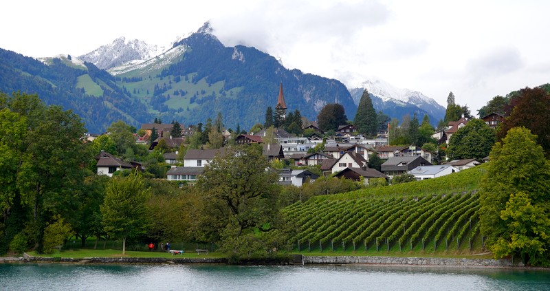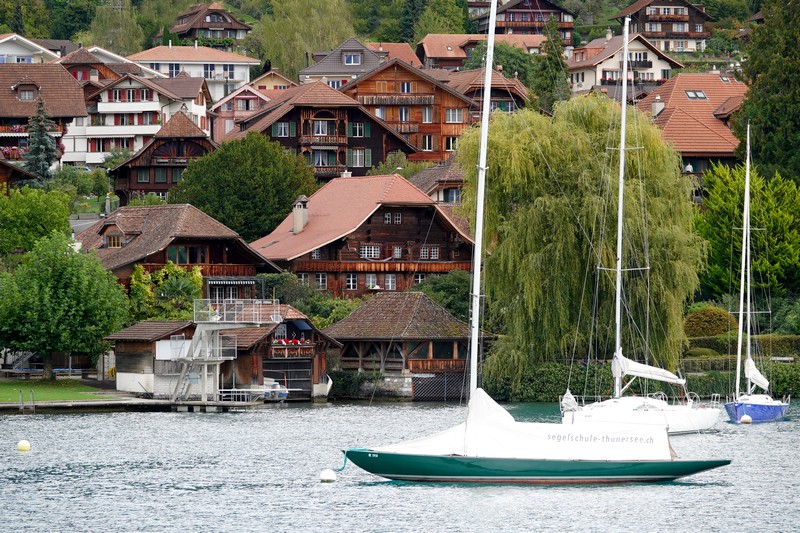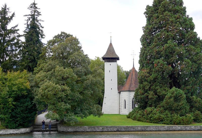 Notre navire quitte Thoune en empruntant un canal parallèle à l’Aar. Au passage, on découvre l’église de Scherzligen – ancien lieu de pèlerinage – puis le Château de Schadau, grosse bâtisse du XIXe siècle, maintenant reconvertie en hôtel et restaurant.