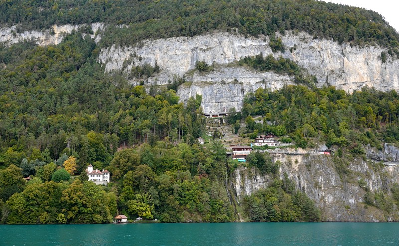 Après un passage sur la rive sud à Spiez – où il y a encore un joli château bâti non loin de vignes, cette fois ! – on repart vers la berge opposée, et on effectue un bref arrêt en contrebas des Grottes de Saint Béatus visitées hier. Vue du lac, la falaise sur laquelle le site est installé parait encore plus imposante…