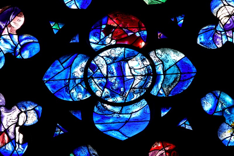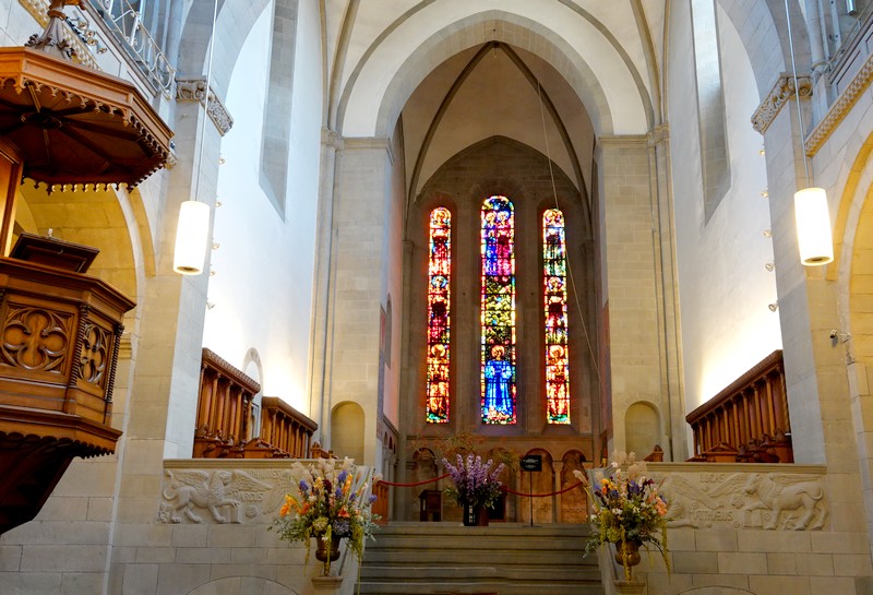 Puis on se dirige vers Fräumunster, un ancien couvent, fondé en 853 et dirigé par des abbesses, qui accueillait à l’époque les femmes de la haute noblesse d’Allemagne du Sud. L’église actuelle date de 1250 mais elle a été rénovée en 1911, dans un style néo-gothique assez austère. Mais ce qui motive notre visite, ce sont les vitraux réalisés par Chagall en 1970. Magnifique !
