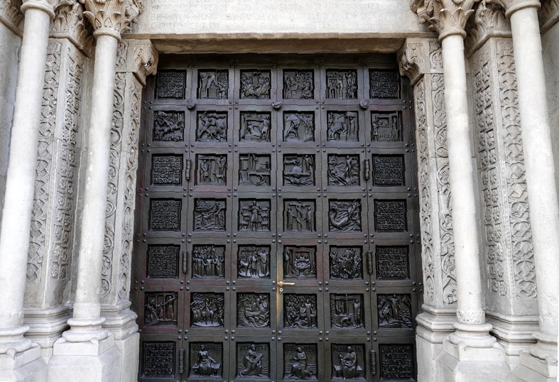 L’édifice religieux est très dépouillé – ambiance réformée de rigueur ! – à l’exception de quelques très beaux vitraux modernes et d’une superbe porte en bronze créée entre 1935 et 1950 par Otto Münch.