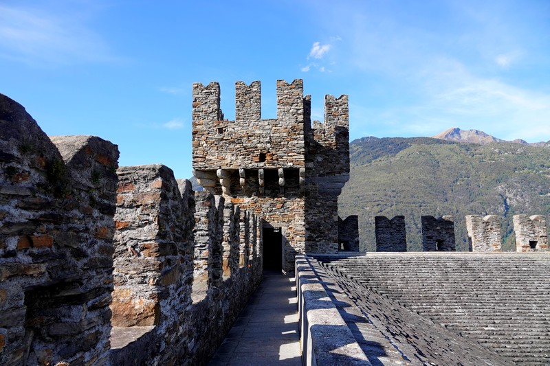 On quitte Castelgrande en longeant les remparts – ce qui est nettement plus agréable que d’emprunter l’ascenseur ! – on traverse de nouveau la Piazza Sole et la Piazza Collegiata et on rejoint la ruelle très pentue qui grimpe vers le Château de Montebello, planté 90m au-dessus de la ville. Une fois de plus, on enchaine les marches… Là, on se rend compte qu’attaquer un tel édifice, en tenue médiévale, ne devait pas être chose facile, le chemin d’accès étant assez abrupt !