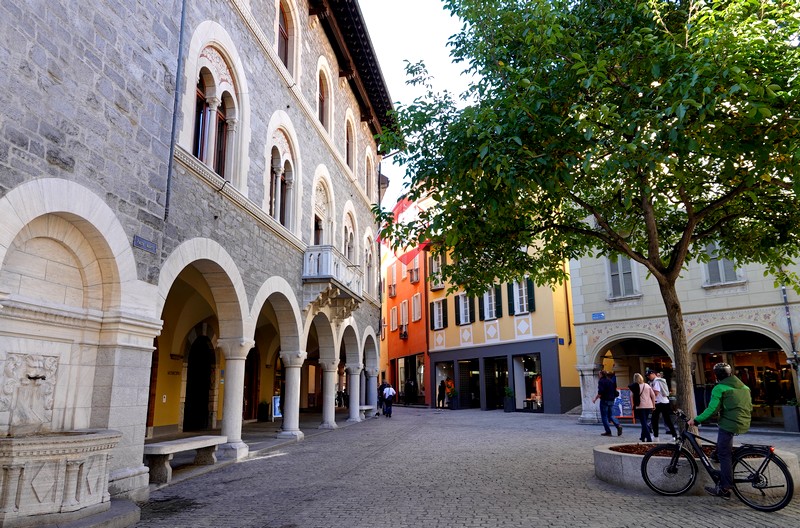 Ce matin, c’est à vélo que l’on part vers Bellinzona car on souhaite tester la piste cyclable qui, en une dizaine de kilomètres, rejoint la plus moyenâgeuse des cités suisses. A 9h, il fait encore frisquet mais le soleil est au rendez-vous ! Arrivés au cœur de la vieille ville, on gare nos montures Piazza Collegiata, une très jolie place dominée par une église à la façade Renaissance. D’emblée, on tombe sous le charme de ce quartier animé et coloré. On y reviendra plus tard, et pour l’instant on file à l’ascenseur qui nous monte en quelques secondes sur l’esplanade du Castelgrande, le plus ancien des trois châteaux forts de la ville.