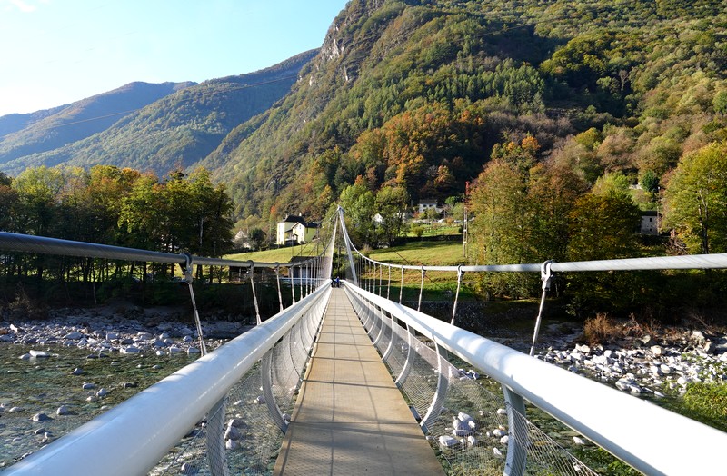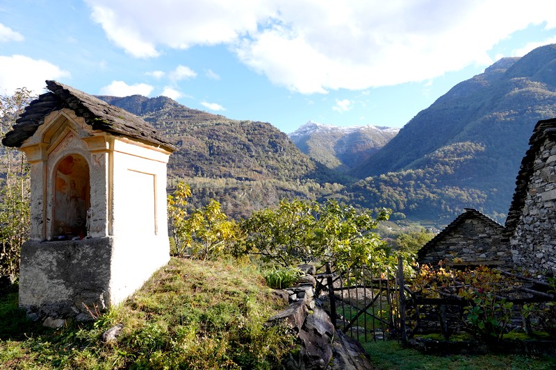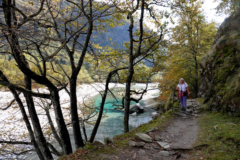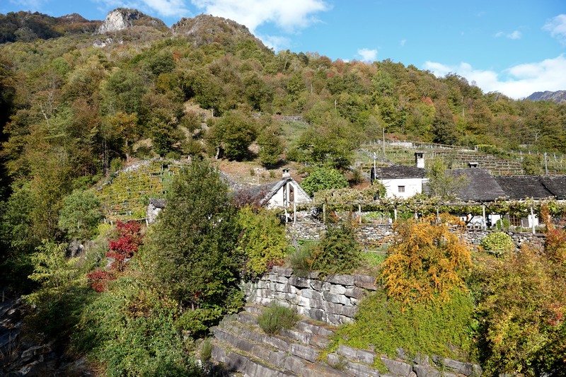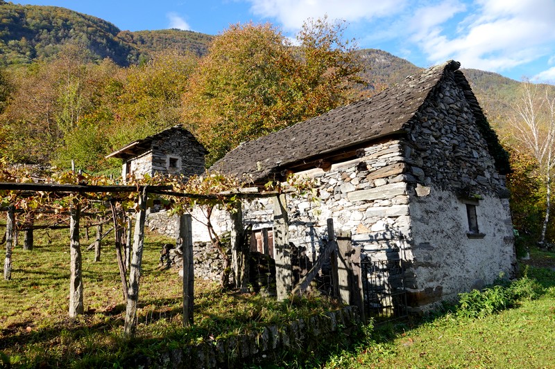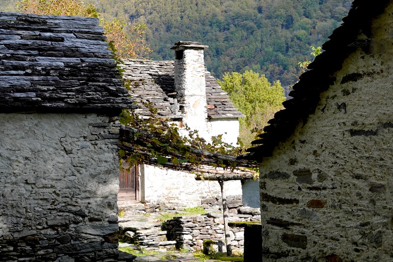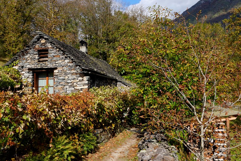 Une passerelle suspendue relie la rive à Giumaglio, permettant ainsi à ceux qui veulent interrompre là la balade de reprendre le bus dans ce village. Comme on n’est pas fatigués – au contraire, on adore ce parcours très varié – on poursuit le sentier qui s’éloigne sensiblement de la rivière et, de nouveau, traverse un hameau aux maisons de pierre.
