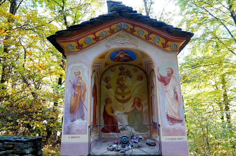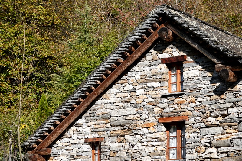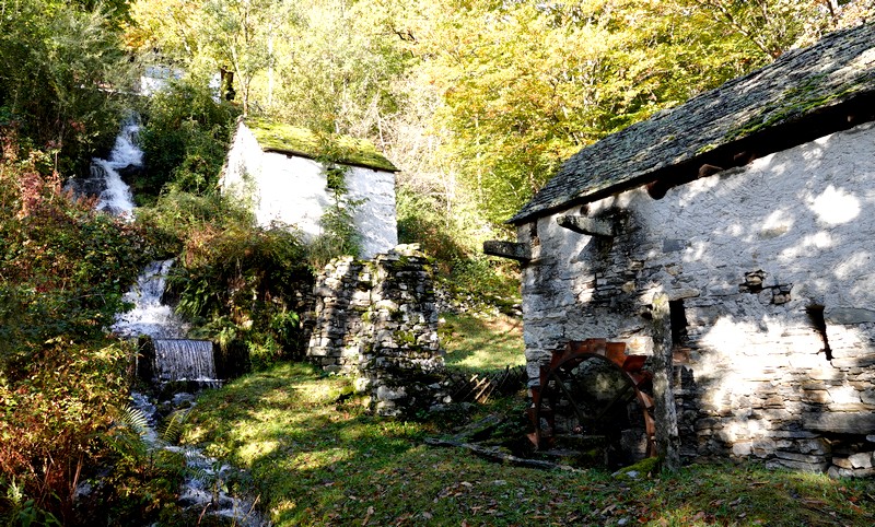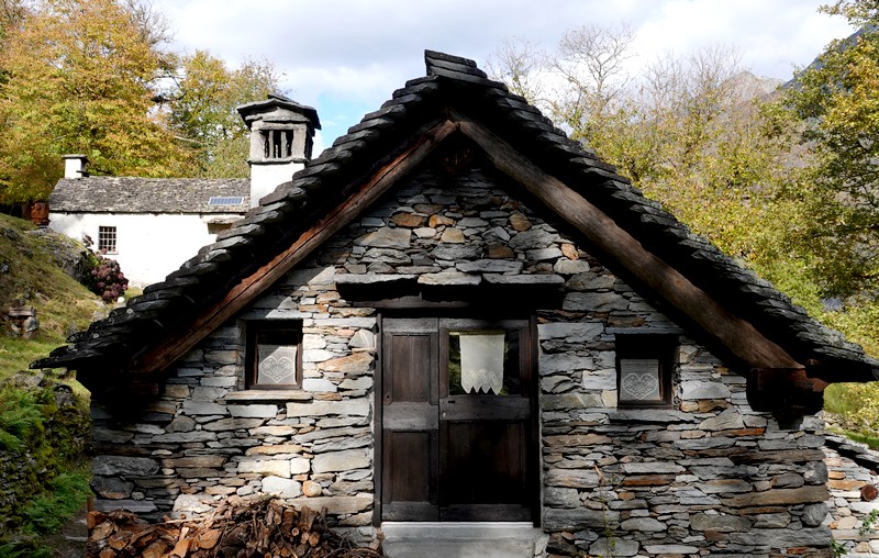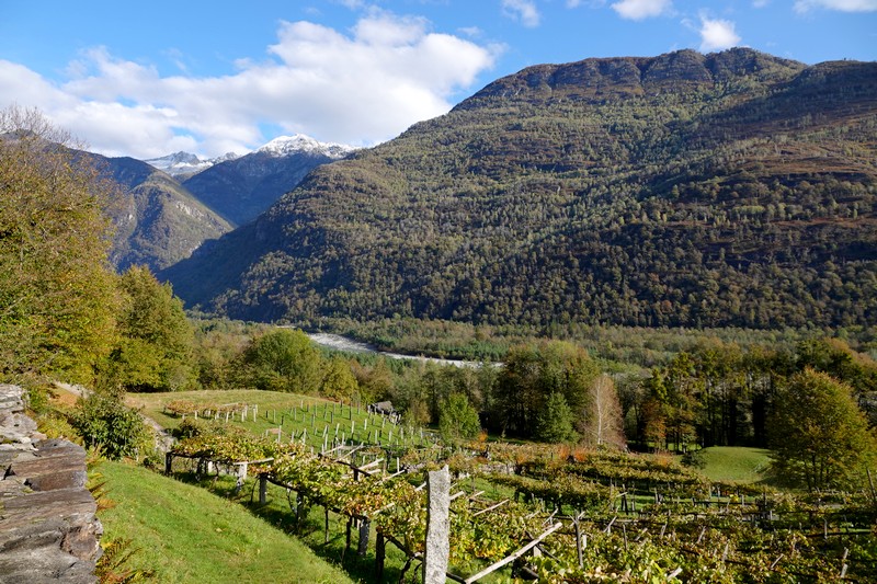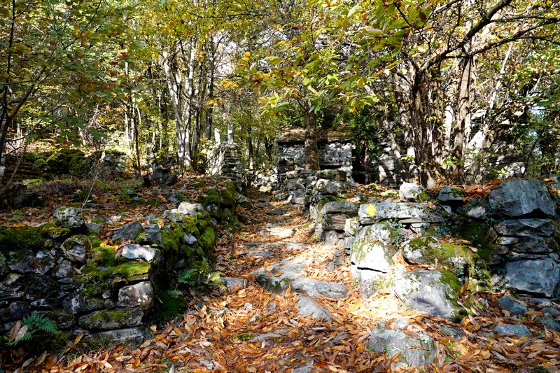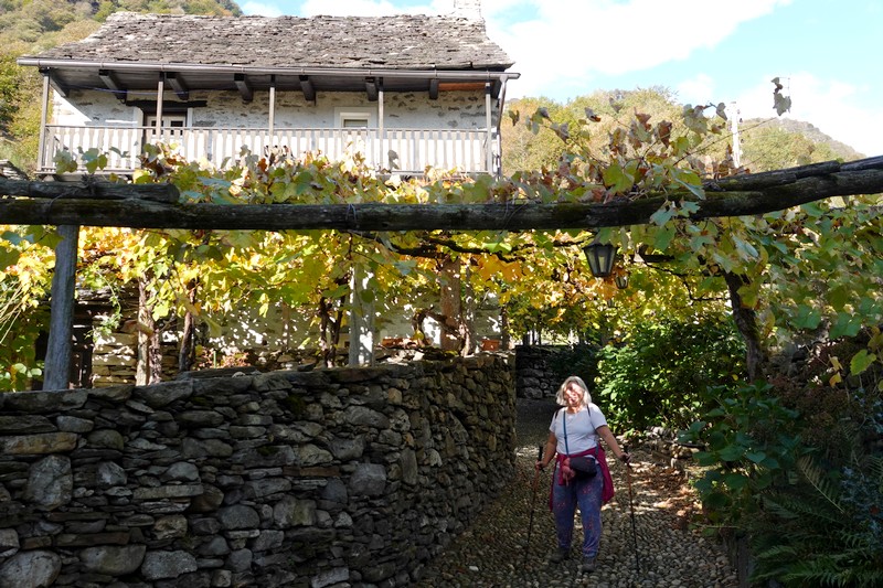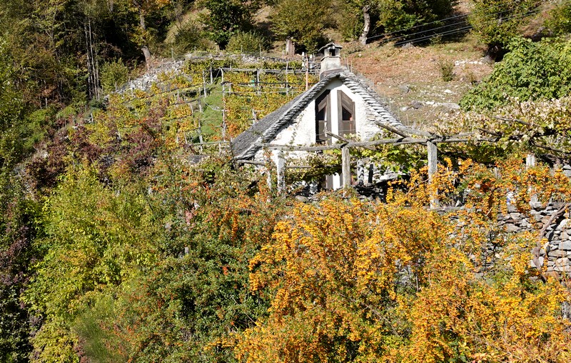 Une passerelle suspendue relie la rive à Giumaglio, permettant ainsi à ceux qui veulent interrompre là la balade de reprendre le bus dans ce village. Comme on n’est pas fatigués – au contraire, on adore ce parcours très varié – on poursuit le sentier qui s’éloigne sensiblement de la rivière et, de nouveau, traverse un hameau aux maisons de pierre.