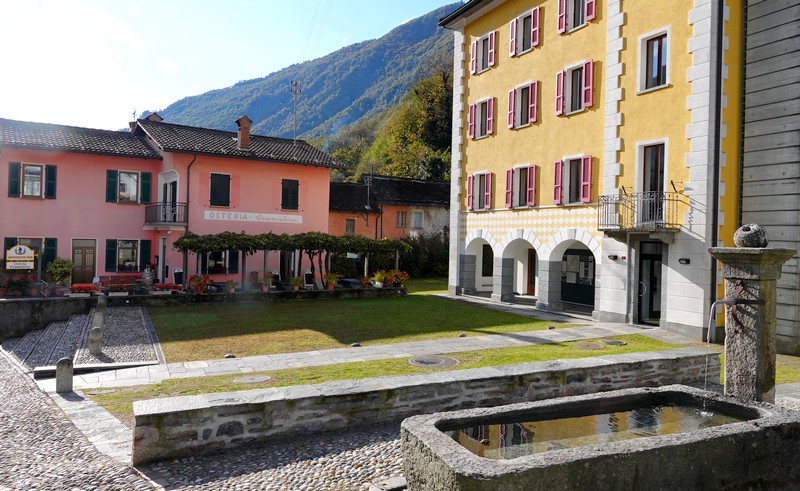 Le soleil devant réapparaitre dans la matinée, à 7h49 on monte dans le bus pour Locarno, d’où l’on enchaîne – après une attente de trente bonnes minutes – avec le 315 qui nous dépose à Maggia, vers 9h30. On est étonné par le monde qui emprunte cette ligne, majoritairement des randonneurs… Mais il faut dire que la Vallemaggia – la vallée la plus longue du Tessin – offre d’innombrables escapades en montagne.