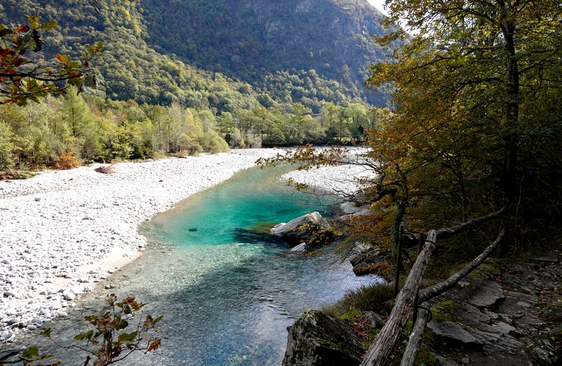 Pour notre part, on opte pour la balade qui relie Maggia à Someo par la rive droite de la rivière. On emprunte d’abord une belle passerelle pour franchir la Maggia – dont les eaux très limpides doivent inciter à la baignade en été – puis on attaque la rando le long d’une petite route qui très rapidement bifurque sur un superbe chemin sous les châtaigniers. Gérard en profite pour ouvrir quelques bogues, et remplir ses poches de châtaignes qui, grillées, seront parfaites pour l’apéro du soir !