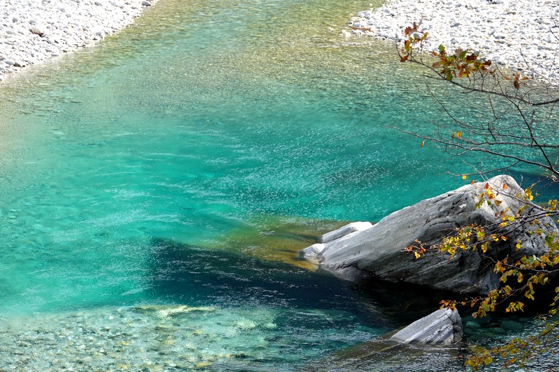 Le chemin rejoint ensuite les berges de la rivière et là, on est carrément ébahis par la couleur de l’eau qui affiche des nuances turquoise dignes d’un paysage de carte postale ! Bon, je ne vais pas vous faire le coup du maillot de bain oublié – il doit fait un petit 10°C à l’ombre, donc assez frisquet – mais si on était venu se promener dans le coin, en été, sûr que l’on aurait piqué une tête ! On se dit également que, vu les alluvions et la largeur du lit de la rivière, celle-ci doit régulièrement inonder la vallée…