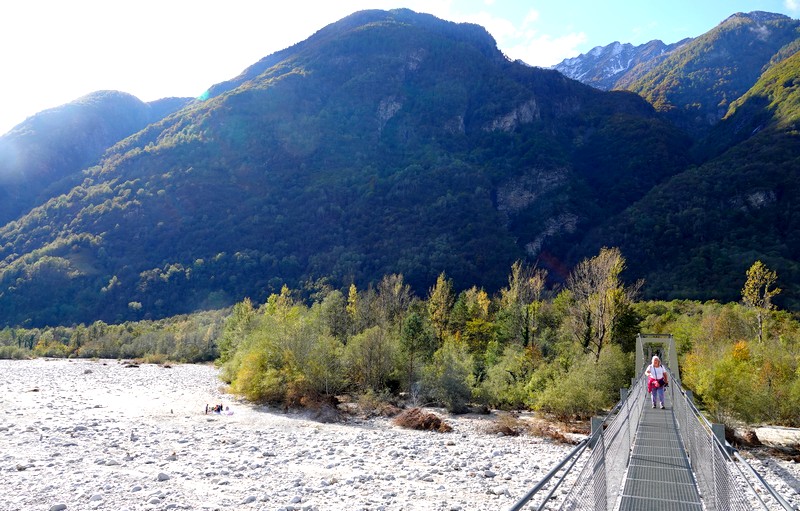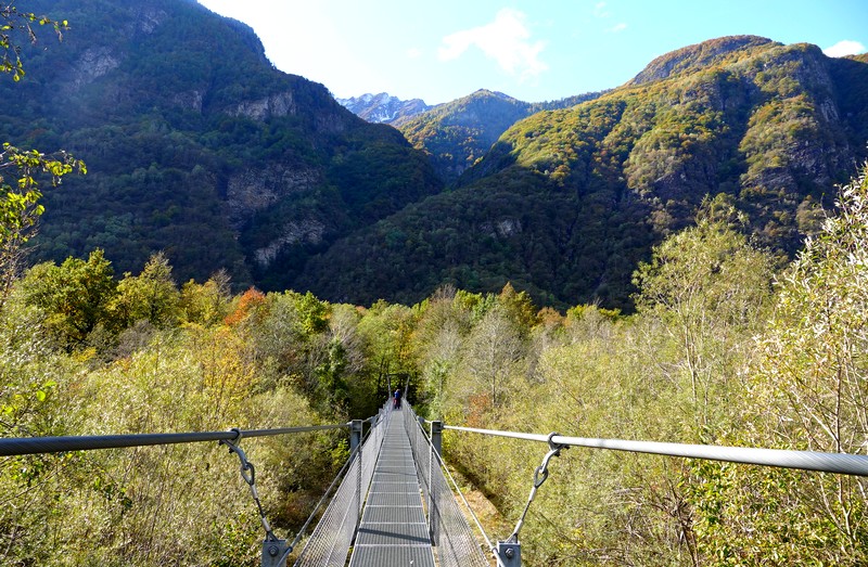 Un peu avant midi et demi, on parvient à la grande passerelle qui rejoint Someo. Longue de 340m, c’est la plus longue de la Vallemaggia, et comme, elle aussi, est suspendue, sa traversée rappelle un peu le tangage d’un bateau pendant une tempête !