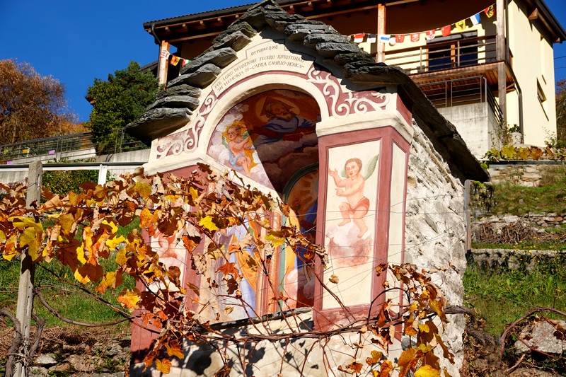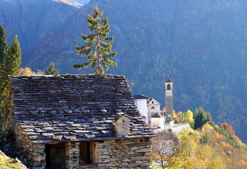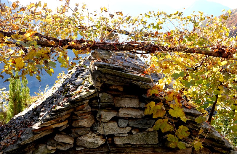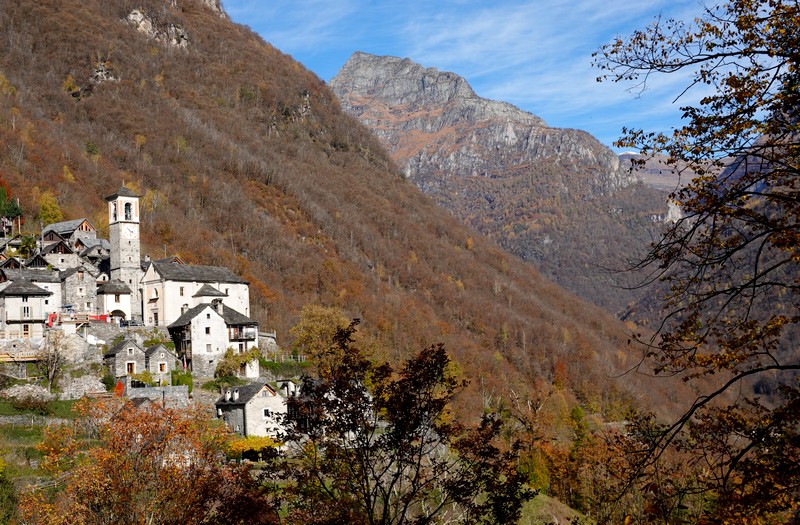 Après 1h45 de marche – dont les trois-quarts en descente assez casse-pattes – on parvient en vue de Corippo qui, jusqu’en 2020, demeura la plus petite commune de Suisse avec ses douze habitants permanents ! Depuis, le minuscule bourg haut perché a été intégré à l’agglomération de Verzasca qui regroupe désormais tous les villages de la vallée. Ici, pendant des siècles, les habitants étaient agriculteurs et bergers et comme à Sonogno, dès le XIVe siècle, pratiquaient la transhumance, hivernant avec les bêtes dans la plaine de Magadino. La route carrossable reliant Corippo à la vallée ne fut construite qu’en 1883, et auparavant, seul existait le sentier muletier. Les conditions de vie particulièrement difficiles, alliées à la pauvreté des ressources agricoles– un peu de chanvre et de vigne – favorisèrent l’exode des habitants vers la plaine.