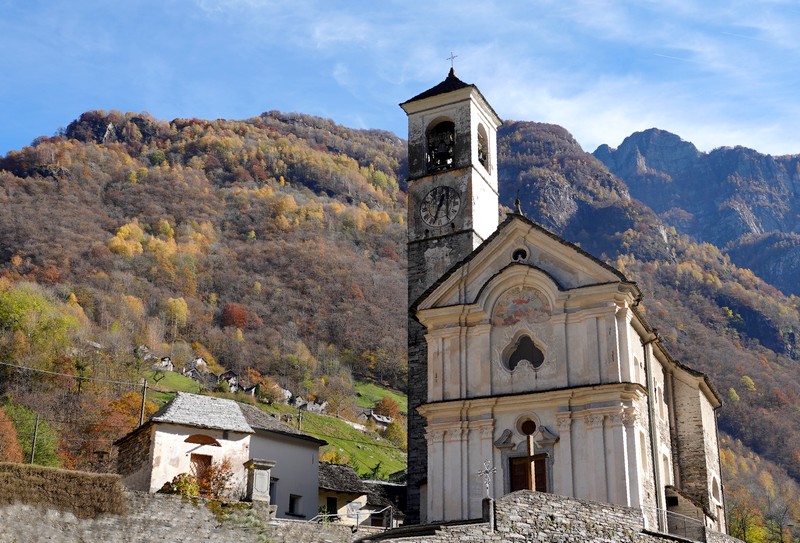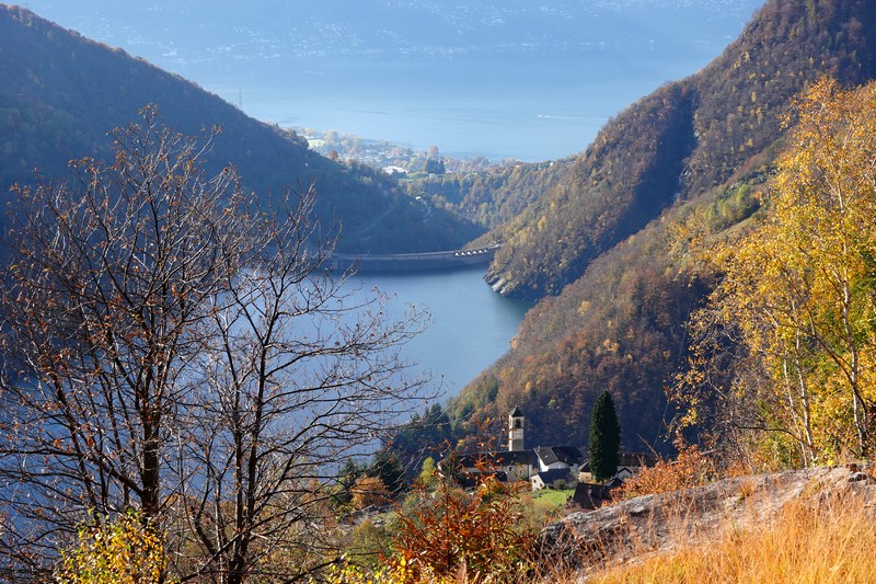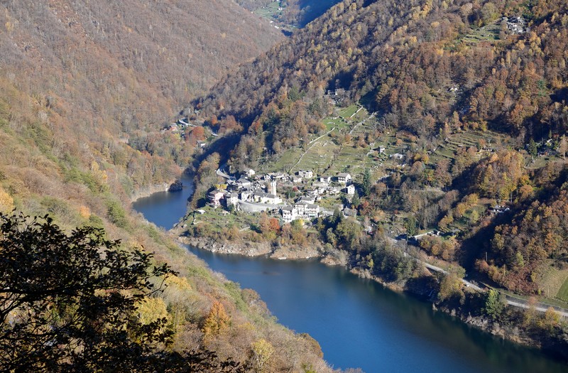 Du haut du village, la vue plongeante sur le lac du barrage de Contra est saisissante ! De ce côté de la vallée, on ne distingue que le bord supérieur de l’ouvrage haut de 220m, et pour le voir dans son ensemble, il faut prendre la route qui monte le long de la rive gauche de la Verzasca. Pour l’anecdote, c’est ici qu’a été tournée la scène mythique du film Golden Eyes où Pierce Brosnan – alias James Bond – effectue un magnifique saut de l’ange à l’élastique !