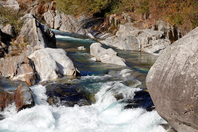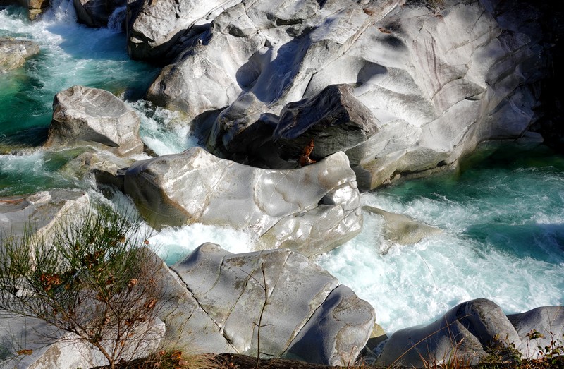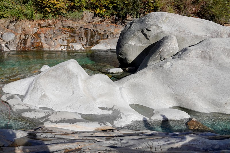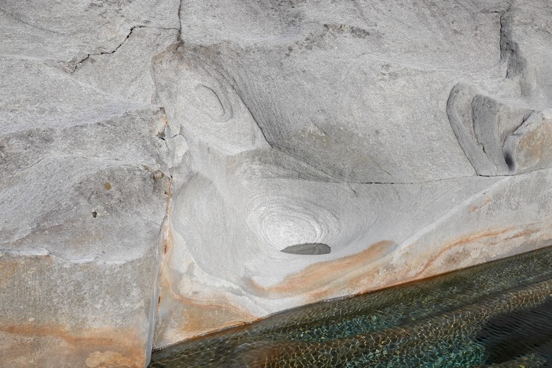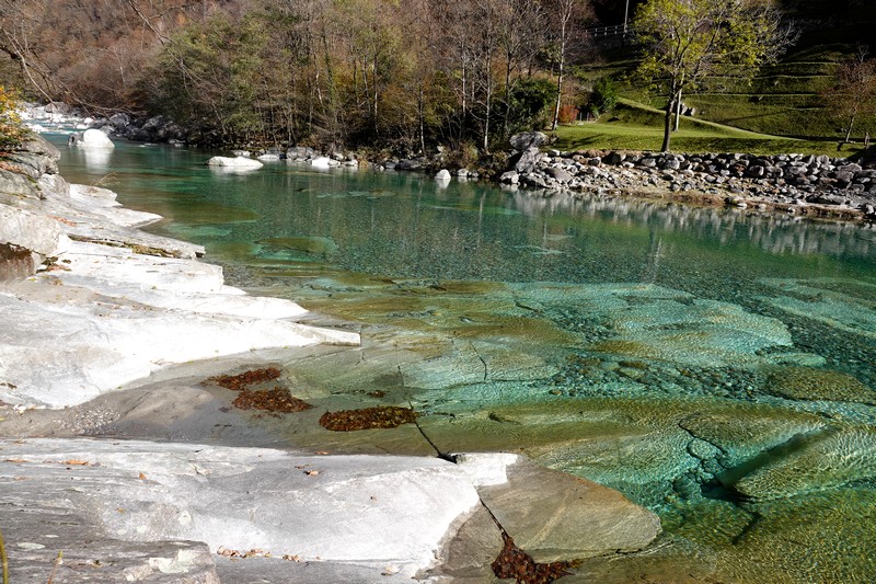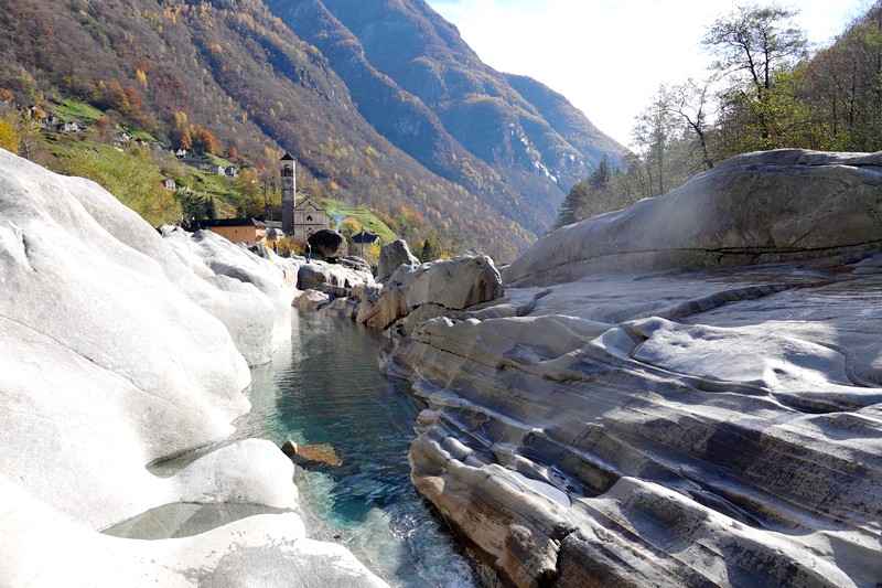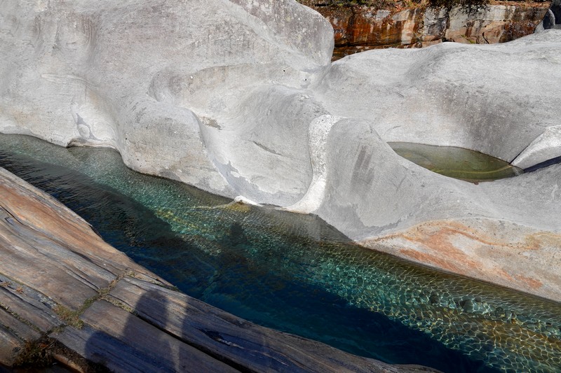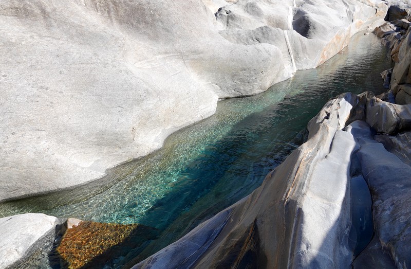 On s’octroie une pause pique-nique, puis on redescend par la route vers la rivière où on récupère le sentier. Et là, on ne prend plein les yeux : la roche du socle cristallin de cette partie des Alpes a été sculptée par la Verzasca, formant ainsi un amas de pierres lustrées et polies par le tumultueux courant. Splendide ! La couleur vert émeraude de l’eau appelle la baignade, mais de nombreux panneaux mettent en garde les amateurs : la fraicheur de l’eau et le fort débit de la rivière engendrent de gros risques d’hydrocution et de noyades…