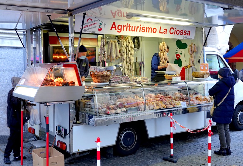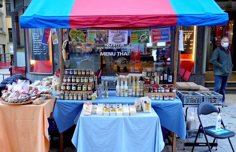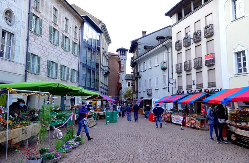 Journées tranquilles au camping. Comme on pense rester ici au moins jusqu’au mois de janvier, on évite de se précipiter en réalisant à la chaine toutes les randonnées du secteur : il faut en garder pour les semaines à venir ! Samedi, on part de bon matin à vélo à Bellinzona. C’est jour de marché, et j’ai absolument insisté pour que l’on arrive avant la foule d’habitués. Résultat, il fait à peine 5°C quand on quitte le camping – autant dire que l’on se gèle un peu, même en pédalant vigoureusement ! – et Gérard peste quand il constate le manque de lumière dans la vieille ville où sont installés les étals.
