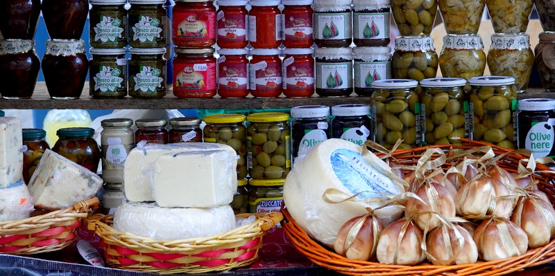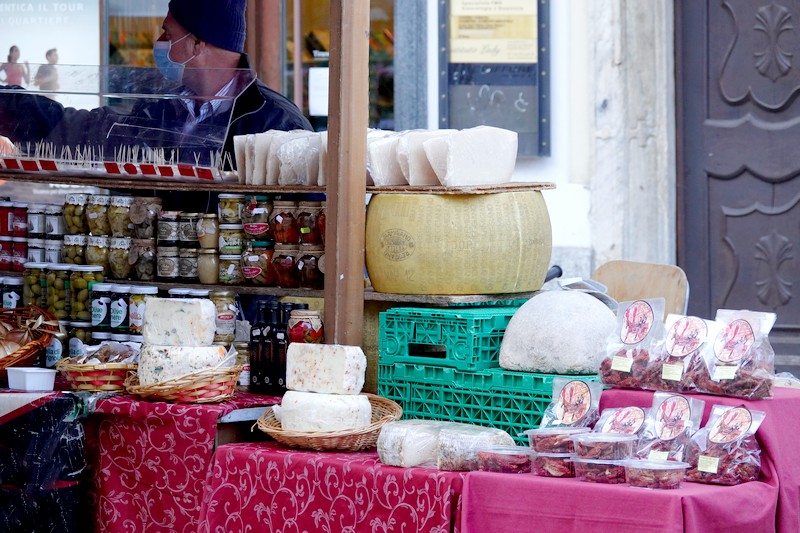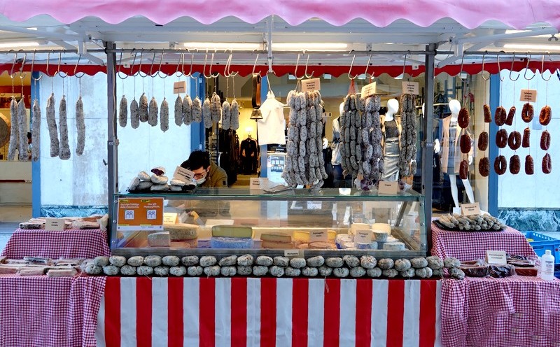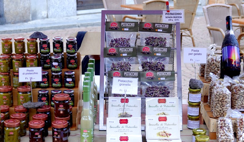 Hé oui, si 8h30 n’est pas le moment idéal pour les photos, c’est parfait pour déambuler en toute tranquillité entre les stands ! On est tout de même un peu déçus par ce marché où, à l’exception d’œufs frais, on n’achète rien tant les produits sont hors de prix – le miel à CHF40 le kilo ou les 200gr de pistaches siciliennes à CHF15, c’est un peu exagéré à notre goût !