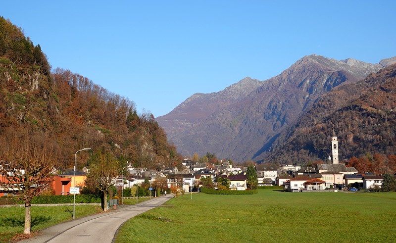 Pour changer, on prend le bus un peu plus tard que d’habitude, à 7h19. Finalement, ce n’est pas une idée très judicieuse car de nombreux lycéens l’empruntent et, même si nous ne sommes pas vraiment entassés les uns sur les autres, il y a trop de monde à notre goût. Résultat, la prochaine fois, on partira soit plus tôt, soit plus tard ! Après un changement de véhicule à Locarno, on arrive à Maggia à 8h30 sous un magnifique soleil. On traverse la passerelle qui enjambe la rivière, et on part en direction de Moghegno. Cette fois, on descend le cours d’eau alors qu’il y a trois semaines, on l’avait remonté jusqu’à Someo !