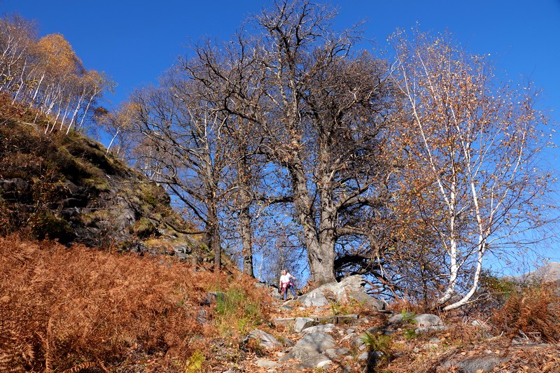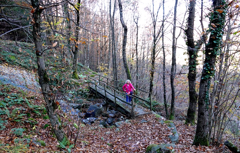 A partir de ce moment, c’en est fini de la petite promenade de santé ! On enchaine désormais les marches de pierre et de bois, sur un terrain assez inégal et bien pentu, dans un cadre sylvestre très agréable parsemé de nombreuses fougères fanées par l’automne. Mais il fait tellement sombre qu’il est difficile de prendre des photos…