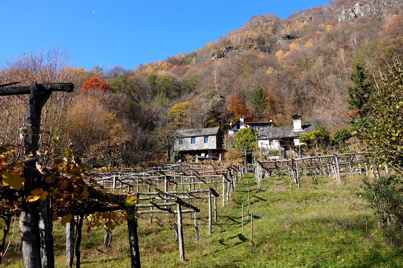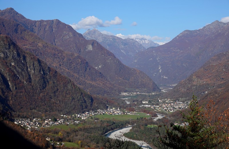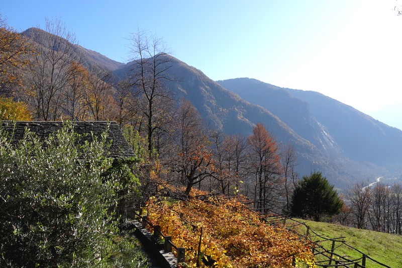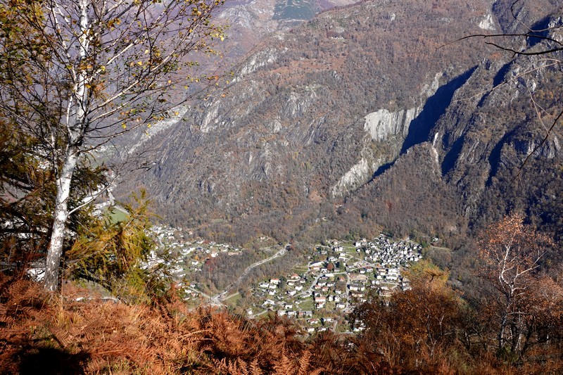 Comme on est à l’à-pic de Tegna, les 550m de dénivelé négatif pour rejoindre le village se font par un sentier très raide, aux marches irrégulières et il nous faut presque une heure trente pour regagner le fond de vallée. Un vrai supplice pour les genoux ! Petite compensation : les très beaux paysages qui nous font, par moment, oublier la difficulté du terrain…