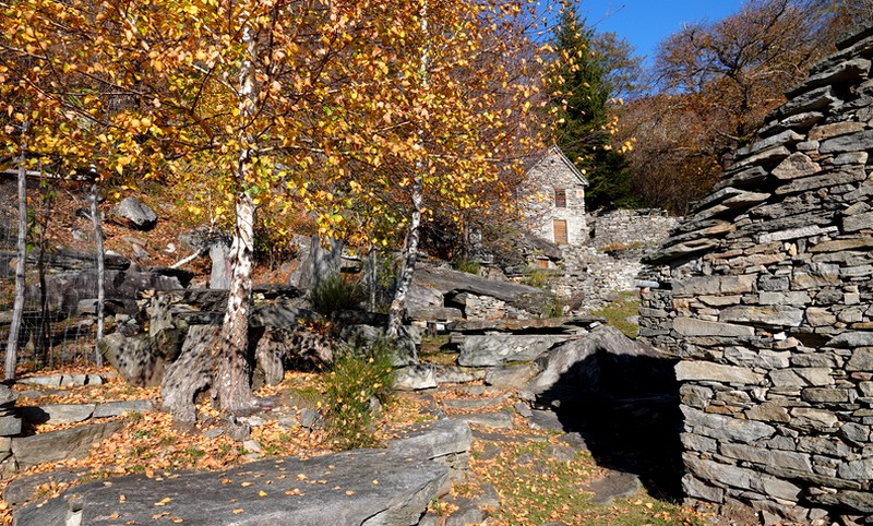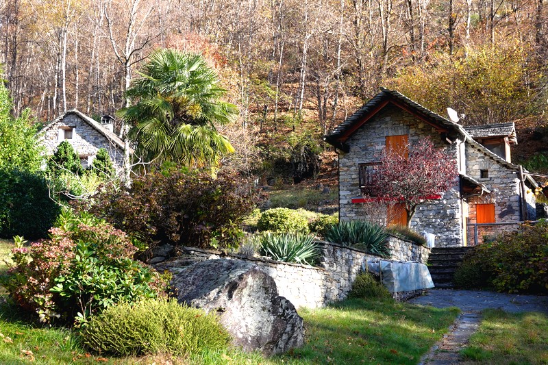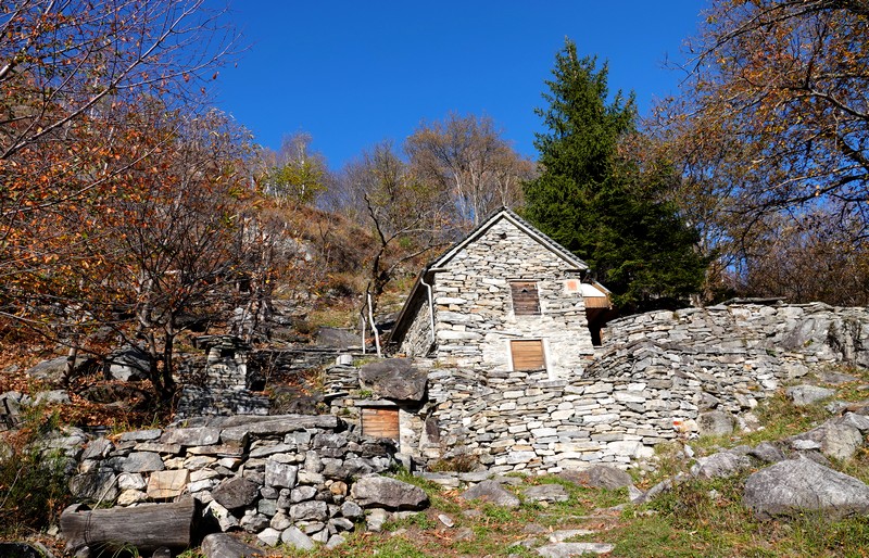 On emprunte ensuite la petite route qui descend à Dunzio où on fait une première pause casse-croute – une habitude prise quand on effectue une rando de plus de quatre heures. A notre grand étonnement, le petit hameau est habité ! Et pourtant, on a vraiment l’impression d’être au bout du monde – ce qui est concrètement faux car nous ne sommes qu’à 7km de Maggia par le bitume – dans un cadre de vie qui peut vite se révéler hostile dès l’hiver arrivé… Ce n’est d’ailleurs pas le première fois que nous observons le phénomène : depuis que nous sommes dans le Tessin, nous ne comptons plus les villages difficiles d’accès mais encore bien peuplés, quand ce ne sont pas les maisons carrément isolées, loin de tout chemin carrossable et ravitaillées exclusivement par monte-charge. Et la plupart du temps, ces habitations sont soigneusement restaurées et entretenues… Surprenant !