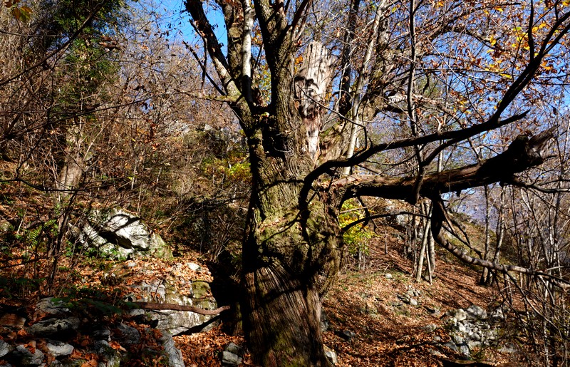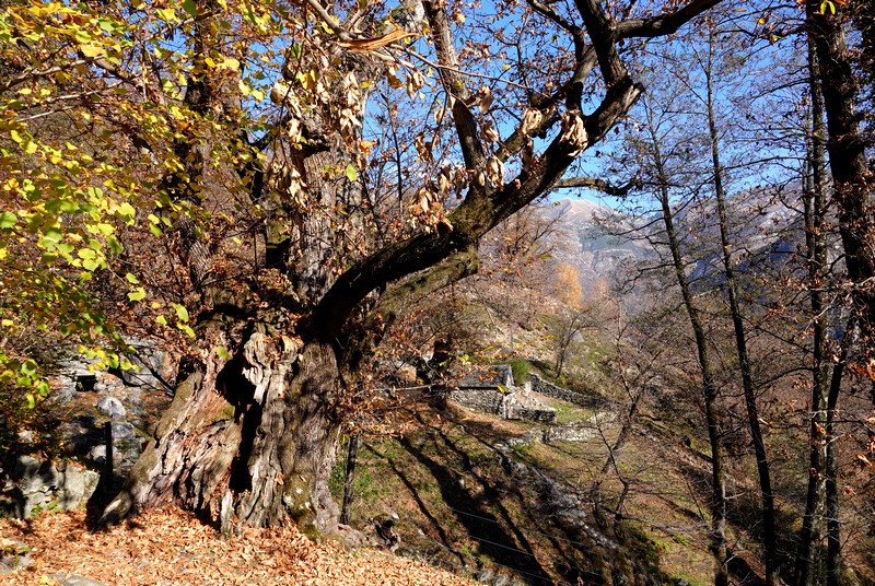 A la sortie du village, on récupère le sentier qui monte vers Streccia. Les châtaigniers sont magnifiques, on passe même à côté de deux énormes spécimens, appelés géants car leur circonférence atteint les sept mètres. Ces vieux arbres, considérés comme monuments naturels, ont entre 350 et 700 ans, et ils ont survécu aux incendies de forêt, aux maladies et à la foudre…