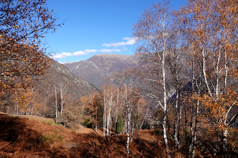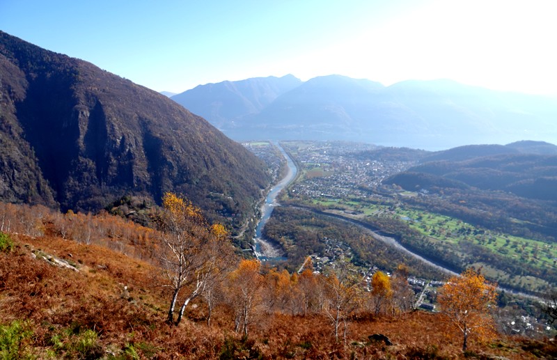 Après cette première belle grimpette qui nous fait transpirer presque une heure, on quitte l’ombre de la forêt pour déboucher sur un beau point de vue sur la vallée de Maggia.