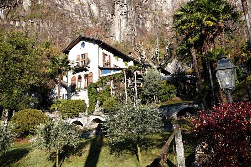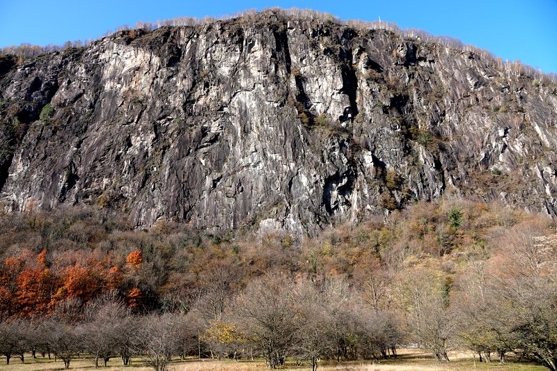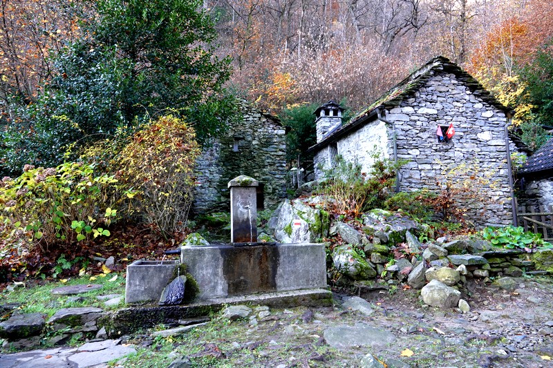Petite grasse matinée puisque l’on ne se lève qu’à… 6h30 ! Eh oui, aujourd’hui on prend le bus un peu plus tard que d’habitude – à 7h49 – car nous allons à l’entrée de la Vallemaggia, et en automne, le soleil ne l’éclaire qu’en milieu de matinée. Après un changement de bus et 45mn d’attente à Locarno, on arrive à Ponte Brolla à 9h30. On passe sur la rive droite – la plus intéressante à nos yeux – et après traversé un hameau à la végétation luxuriante et renommé pour ses grotti – restaurants traditionnels – on attaque la rando.