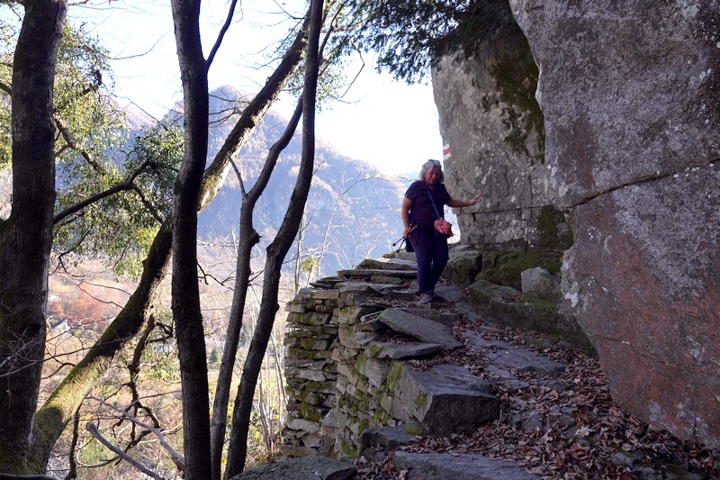 Une fois sortis de la forêt – on bénéficie à cet endroit d’un beau point de vue sur Avegno – on redescend vers la Maggia par un escalier de pierre bien raide et surtout très aérien. En bas, le chemin est plus aisé, et maintenant on évolue sur du sable. Variée, la balade !
