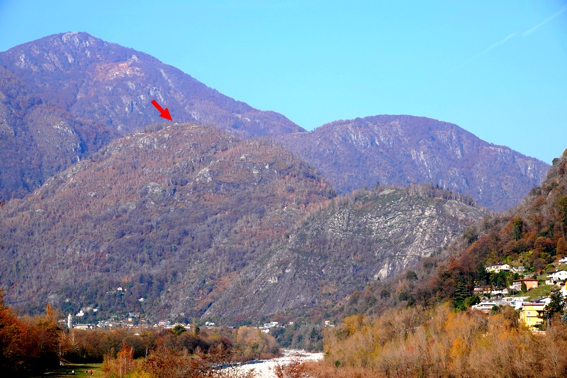 On traverse la Maggia – oui encore ! – et depuis la passerelle, on aperçoit le Mont Colma gravi lundi dernier (flèche rouge)… Beau massif !