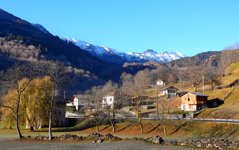 Un petit tour vers le Val Blenio… et puis s’en va ! Eh oui, cette sortie s’est conclue par un flop certain : j’avais prévu une rando en boucle sur le sentier historique n°1, au départ d’Acquarossa. Fidèles à nos habitudes très matinales, nous arrivons donc dans la vallée sur le coup des 8h30, après un petit enchainement de transports parfait. Sauf que… c’est bien trop tôt ! Dans ce site très encaissé, en fin d’automne, le soleil ne doit pas pointer son nez avant 10h / 10h30, voire même plus tard… Comme on n’a aucune envie de randonner dans de mauvaises conditions, on décide de rester dans le bus et de poursuivre jusqu’à Olivone, le terminus de la ligne. Étant les seuls passagers, cela fera de la compagnie au chauffeur ! Parvenus à destination, on doit se rendre à l’évidence : premièrement, il fait froid – aux alentours de 0°C… Et deuxièmement, l’itinéraire qui nous tente – vers le col de Lucomagno – est bien trop long à réaliser à cette saison… Du coup, on fait un tour dans le village – ça réchauffe ! – on passe à la boulangerie acheter le pain et… on reprend le bus de retour une heure plus tard ! La marche aura donc été de très courte durée, et finalement, c’est au camping, sous un franc soleil, que nous dégustons notre pique-nique ! Conséquence de ce petit « raté » : une seule photo, prise à Olivone, non loin de l’arrêt de bus ! Mais c’est sûr, aux beaux jours, on reviendra dans cette vallée qui semble superbe…