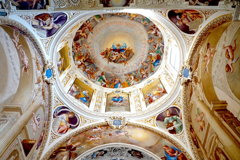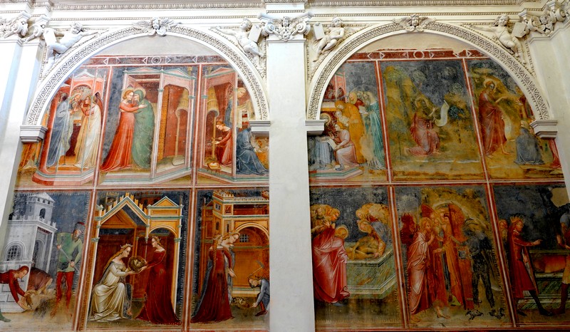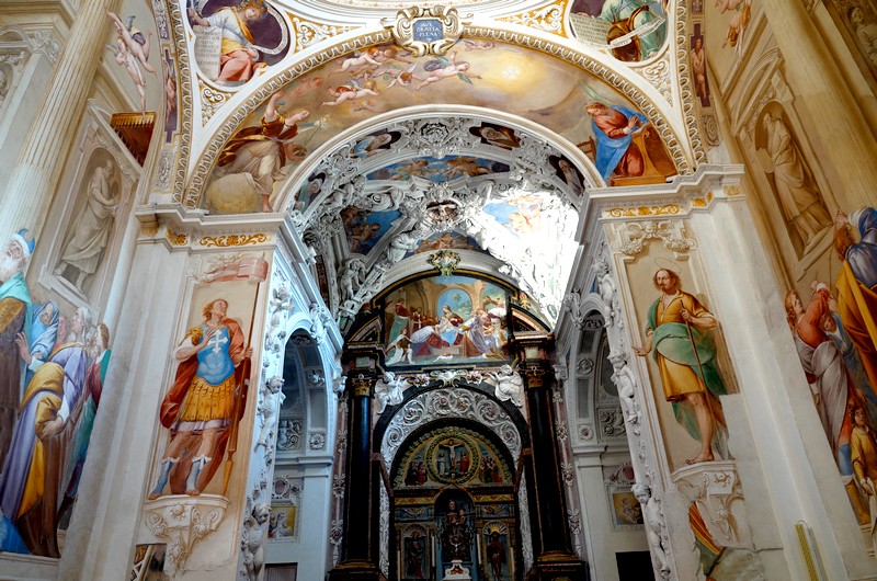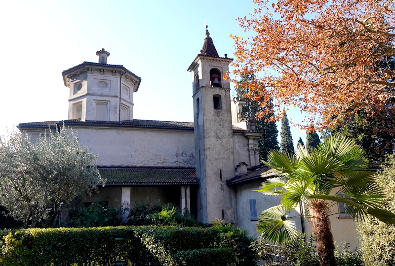 Comme on a presque une heure devant nous avant le prochain bus, on remonte la route principale à pied jusqu’à l’arche qui matérialise la frontière. En chemin, on visite le sanctuaire Santa Maria dei Ghirli, posé en bord de lac, dont les fresques les plus anciennes datent du XIIIe siècle. Le cadre est somptueux et un temps, on oublie l’impression de désolation que nous a laissé Campione.