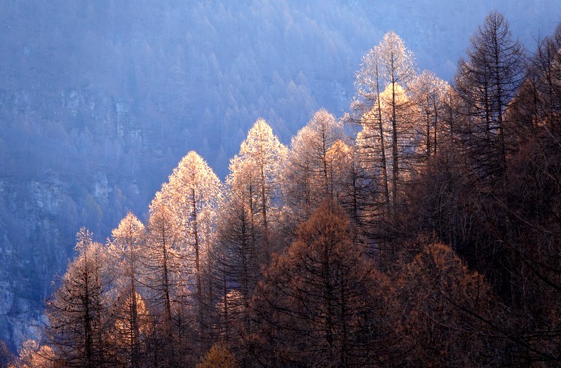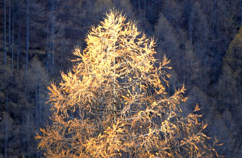 Après une heure de marche – on a vraiment pris notre temps ! – on rebrousse chemin, et c’est à ce moment que le soleil commence à éclairer le village situé en contrebas, illuminant les quelques sapins de leurs dernières couleurs d’automne. Le jeu de lumière crée ainsi un superbe contraste avec le reste de la végétation, aux teintes plutôt sombres et hivernales.