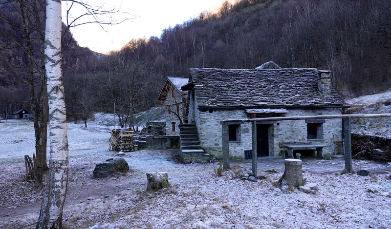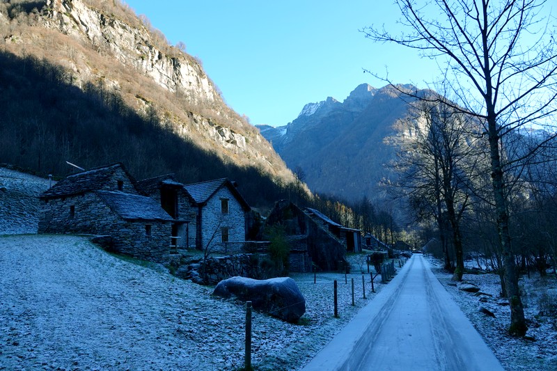 Cela faisait un moment que nous désirions revenir dans la belle vallée de la Verzasca, mais nous espérions une tombée de neige pour la découvrir sous un autre angle. Ne voyant point venir les flocons mais sachant notre départ du Tessin assez proche, c’est donc aujourd’hui que nous effectuons ce retour tant attendu. La météo ayant annoncée une belle journée, nous ne trainons pas – avec un réveil à 5h30, c’est le moins que l’on puisse dire ! – et après deux trajets en bus, nous arrivons à Sonogno à 8h30. Pourquoi être si matinaux, me direz-vous ? Tout simplement car ce fond de vallée est principalement ensoleillé le matin ! Bon… là, on est peut-être un poil trop tôt car tout le village est encore plongé dans l’ombre… On se réfugie donc une bonne demi-heure dans l’unique café ouvert, et après deux expressos, on est suffisamment réchauffés pour affronter la fraicheur ambiante – à vu de pieds et de doigts gelés, on doit avoisiner les -5°C !