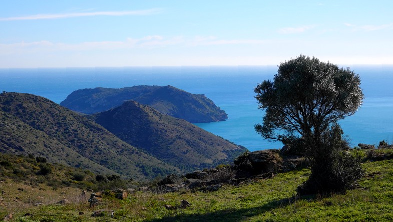 Nous poursuivons l’ascension et rapidement nous parvenons à une fourche. Problème : il n’y a aucun fléchage ! La logique nous ferait bien partir à gauche, mais la curiosité nous entraine vers la droite… On débouche alors sur un plateau très venteux qui domine toute la baie de Montjoi : sublime !