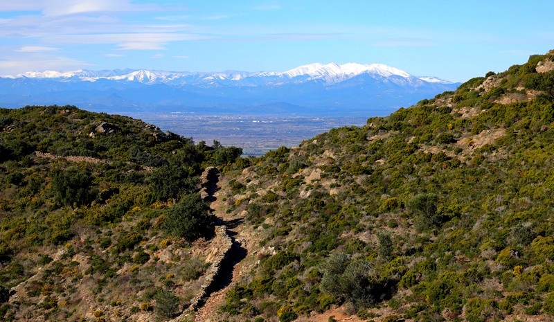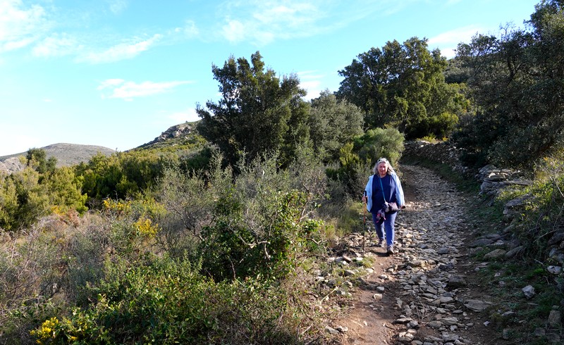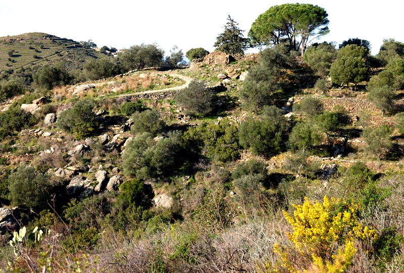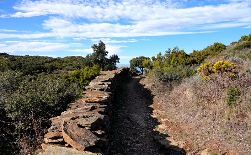 Là, deux options s’offrent à nous : suivre la piste qui traverse le plateau sans savoir où elle nous mènera – en réalité, elle rejoint la route de Montjoi dans un sens, et celle de Cadaquès dans l’autre – ou revenir sur nos pas pour reprendre le fil de la balade. Comme on n’a toujours pas vu les menhirs annoncés, on opte pour la seconde solution. On redescend donc jusqu’à la fourche, et là, on suit un très bel itinéraire qui serpente entre murets de pierre sèche, chênes lièges et végétation basse.